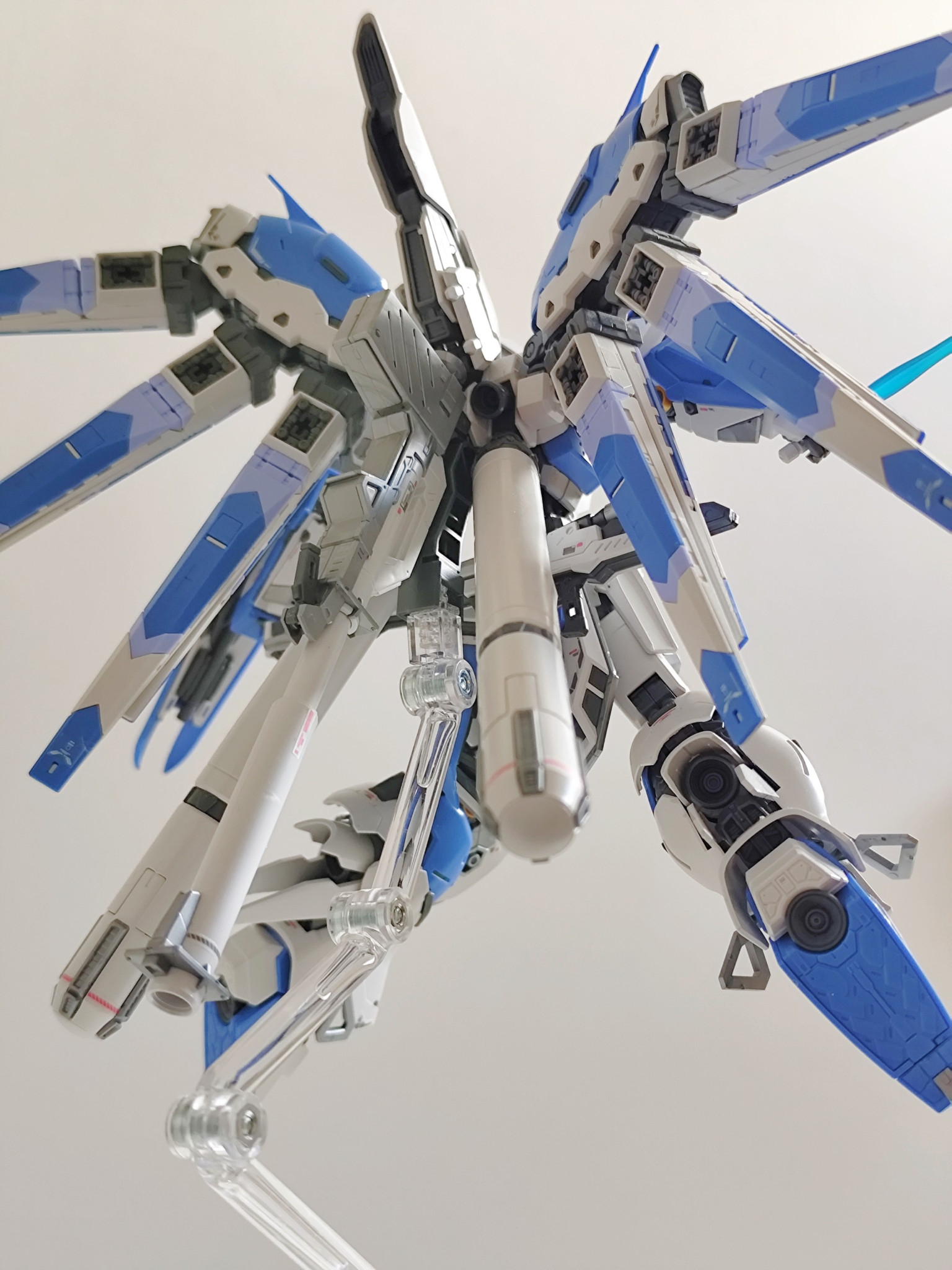 RGハイニューは背中もスゴい迫力です。ライフル、バズーカをマウントさせてますが足の展開ギミックと合わさって情報量が段違いですね