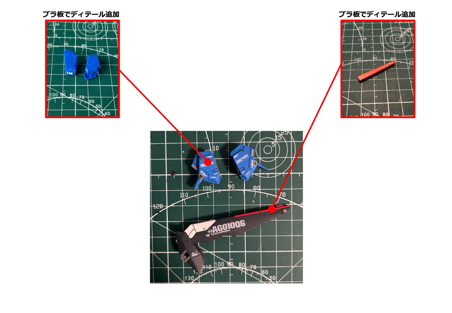 ですが2体目になるとどこが壊れやすくて、どのように対処すればいいか知識があるので余裕が出てきて「ディテール追加を色々とイジってみよう」という欲に負け、いろいろとてんこ盛りにしてみました。感じ的には細身のRGに肉付けしてテレビ版ゼータぽくしてみました。