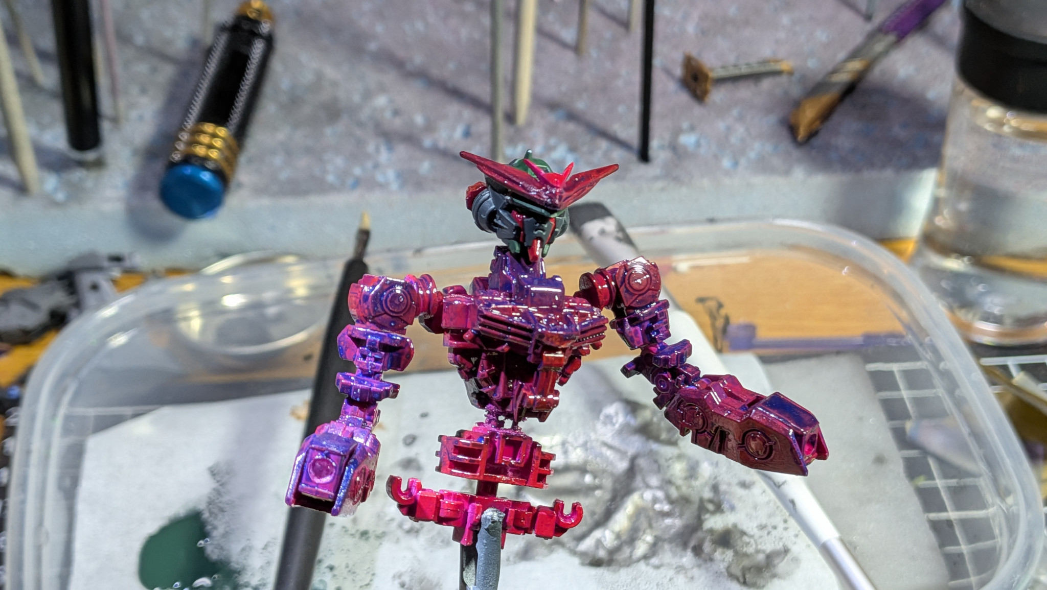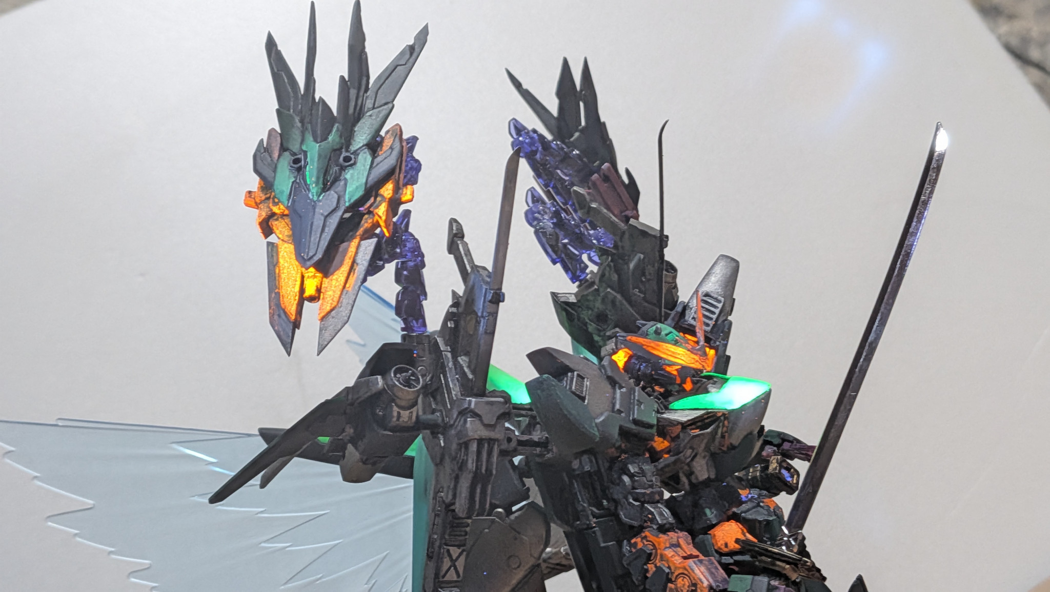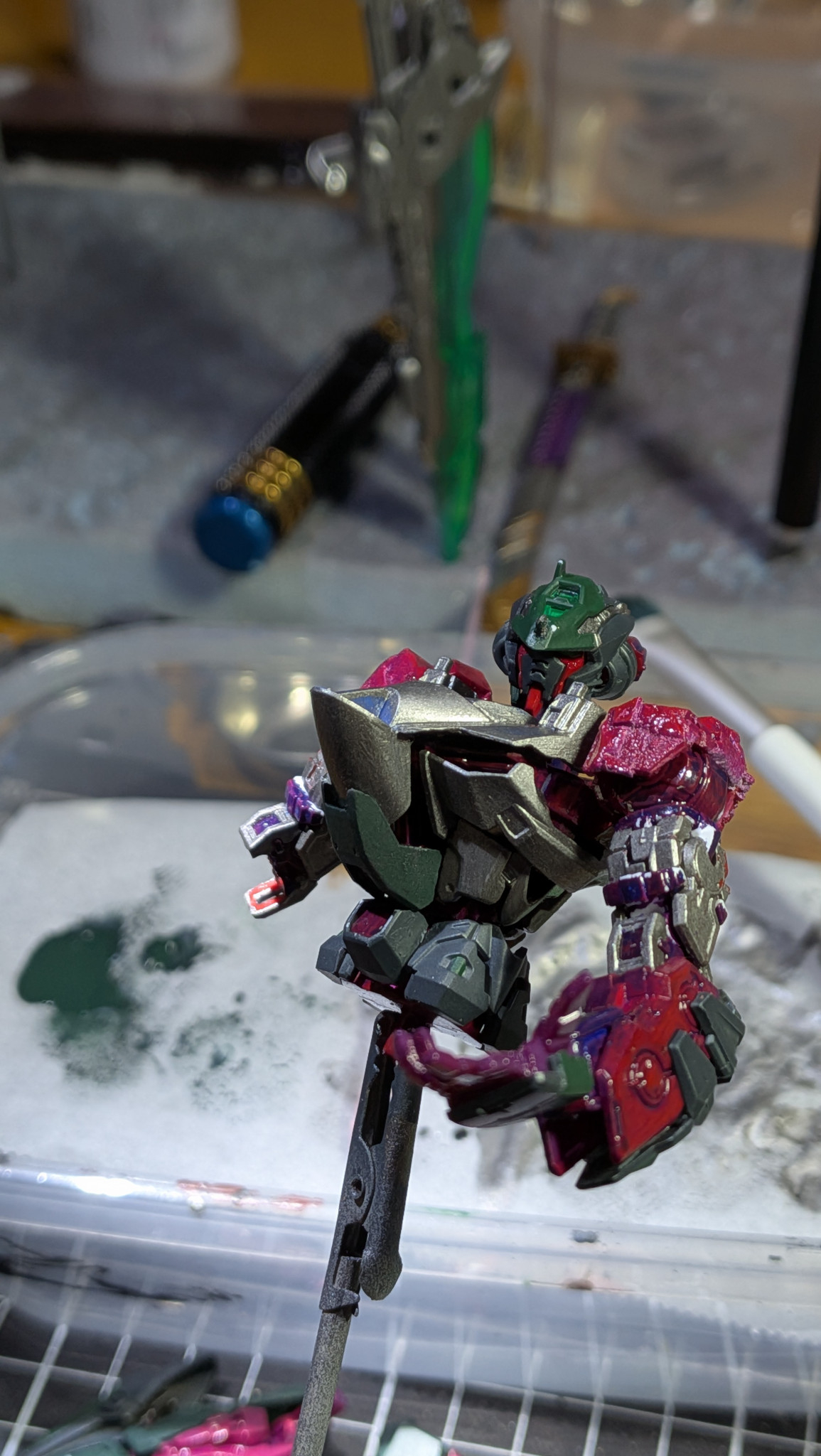 なので、フレームを紫、装甲を緑にして「アストレイバープルフレームグリーンドラゴン」になりました。来年、アストレイレッドフレームレッドドラゴンが発売との事でちょっと寄せた感じにしてみました👍🏻