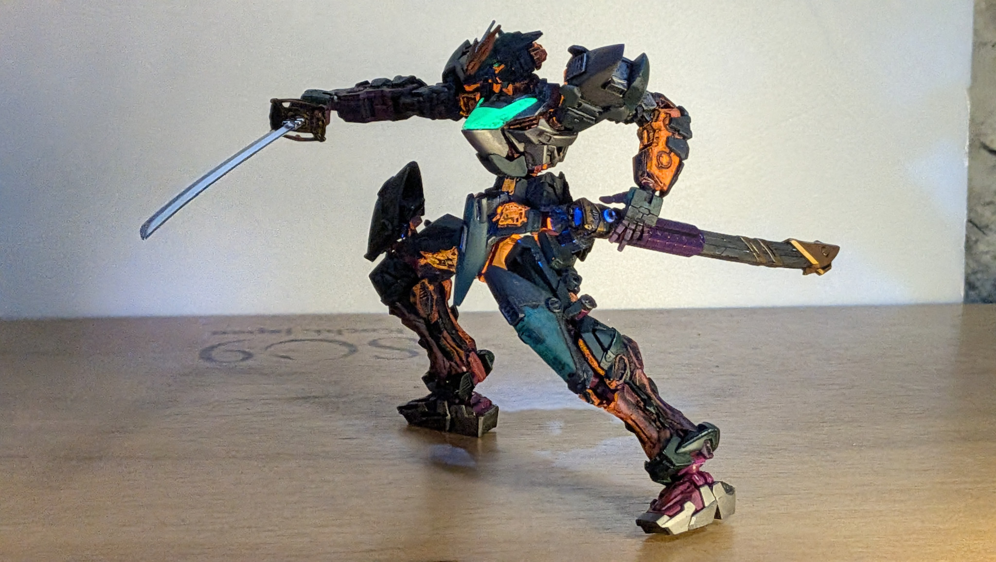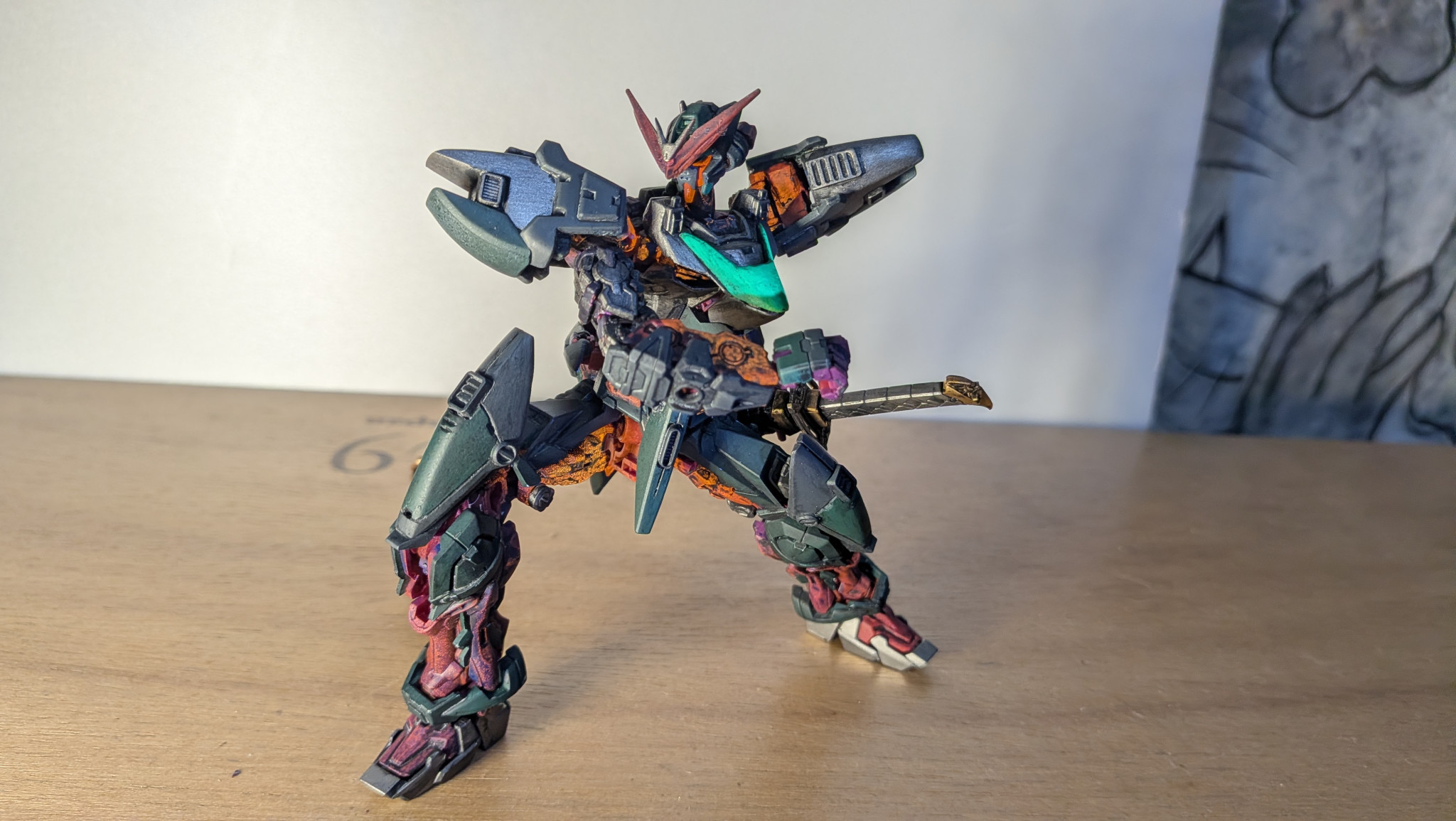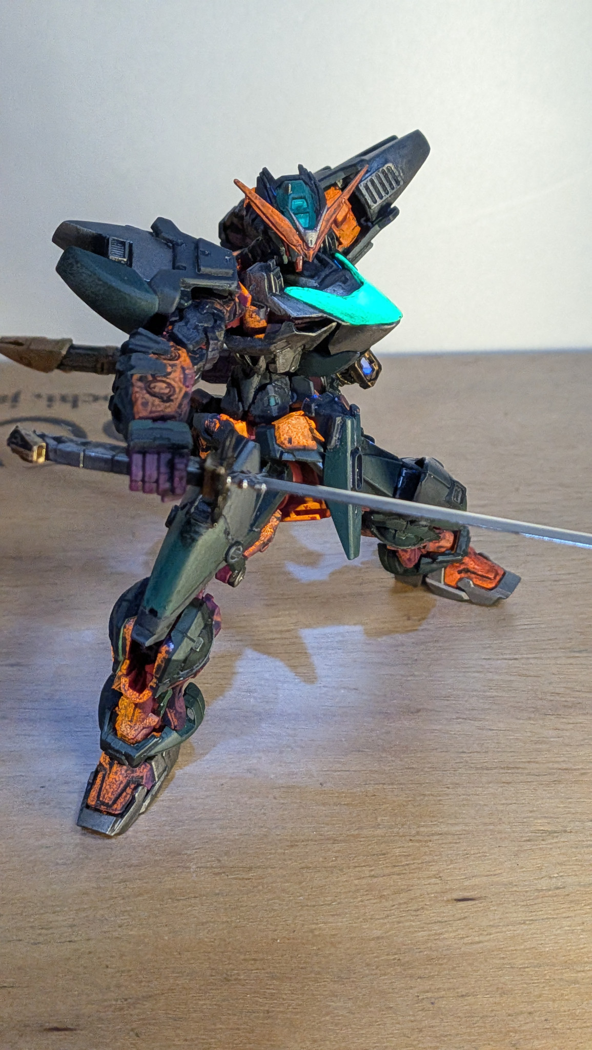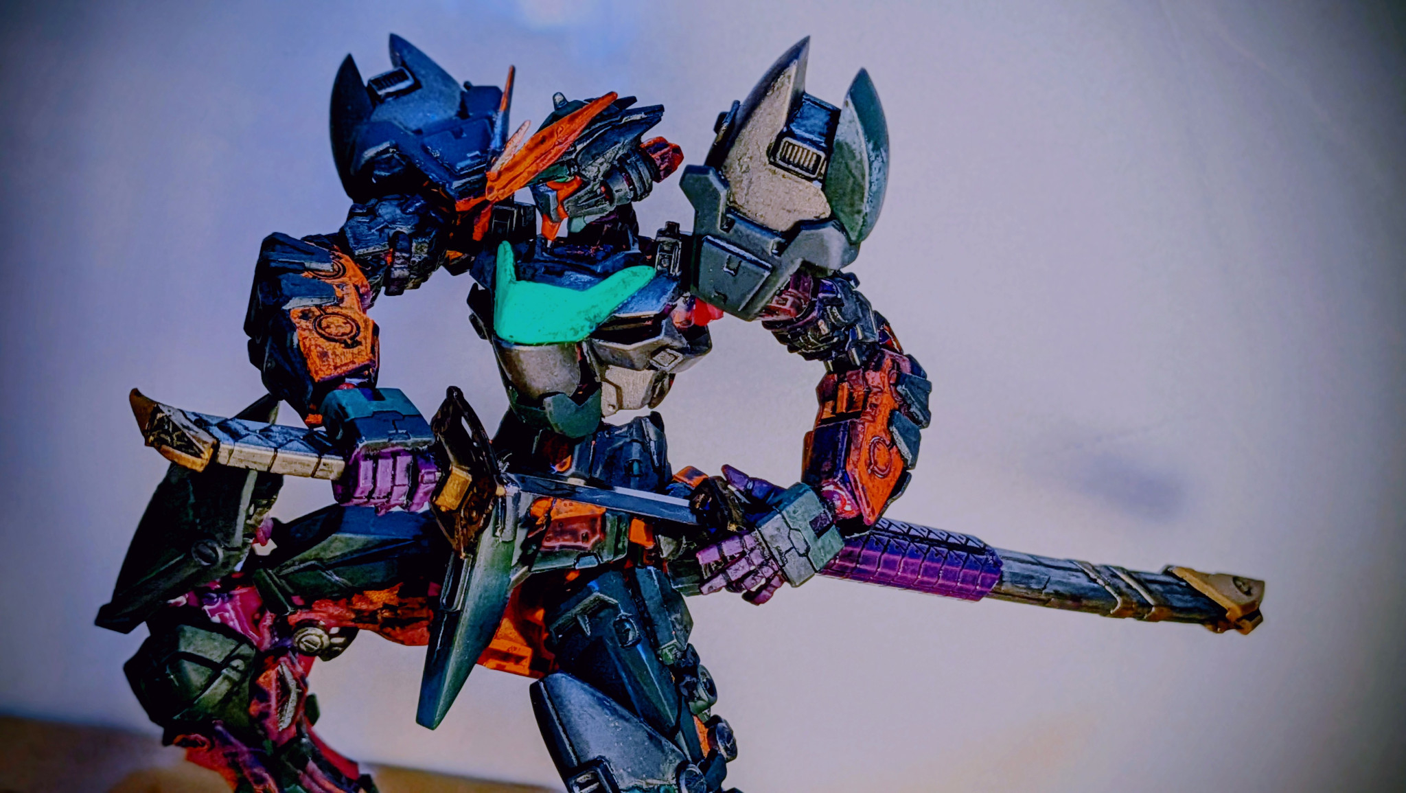 なので、フレームを紫、装甲を緑にして「アストレイバープルフレームグリーンドラゴン」になりました。来年、アストレイレッドフレームレッドドラゴンが発売との事でちょっと寄せた感じにしてみました👍🏻