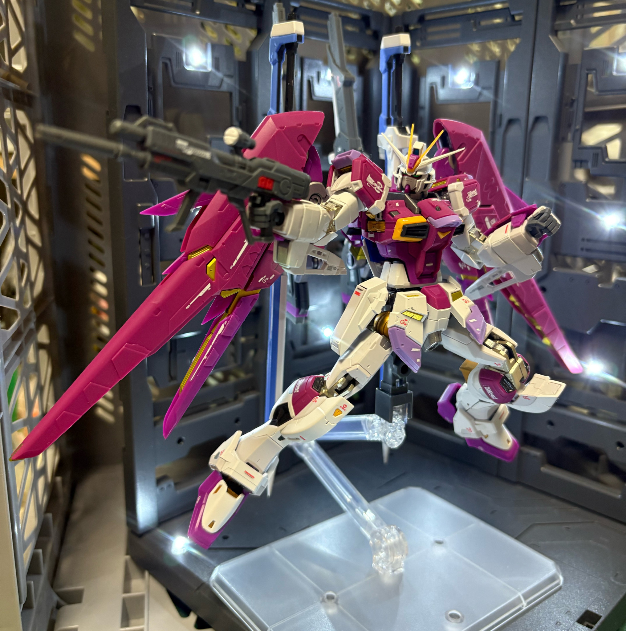 一応seed撃ちポーズのつもりですが、フリーダム系のゴールド関節に対抗して関節をシルバー系の塗装をしてまして、関節がギチギチになりました。(壊れるの怖い)