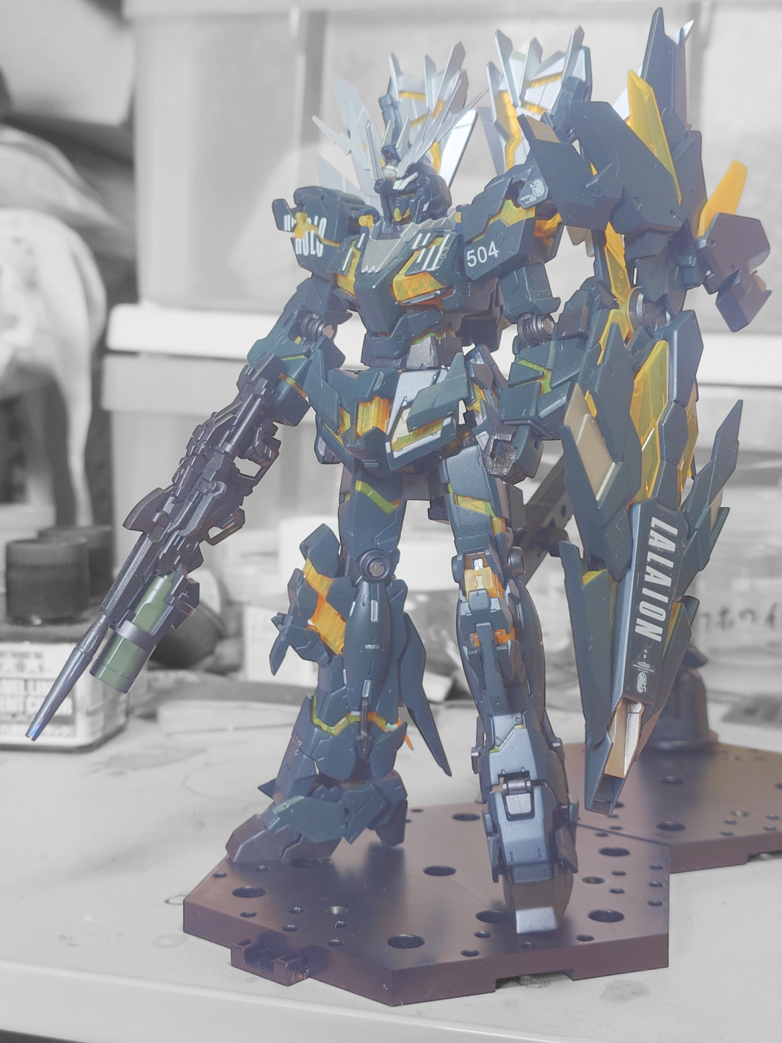 トップには半光沢をふいて完成させました。半年ぐらいかけてゆっくり作ったのですが、RGユニコーン系はすっごく大変でした…塗装のムラもあるのですが、ゆっくり制作出来たので世界初?のRGバンシィ(獅白ぼたん専用機)が完成しました。