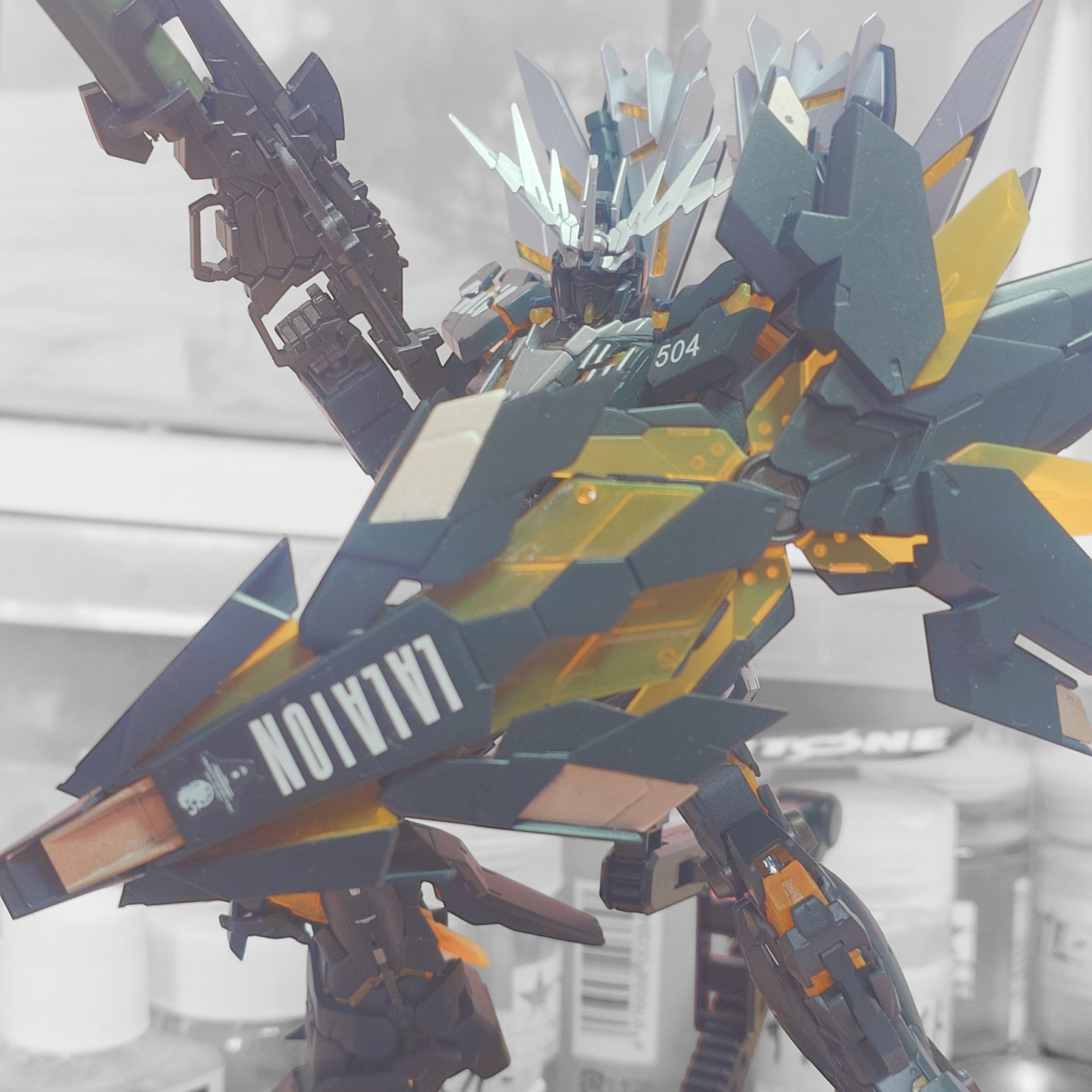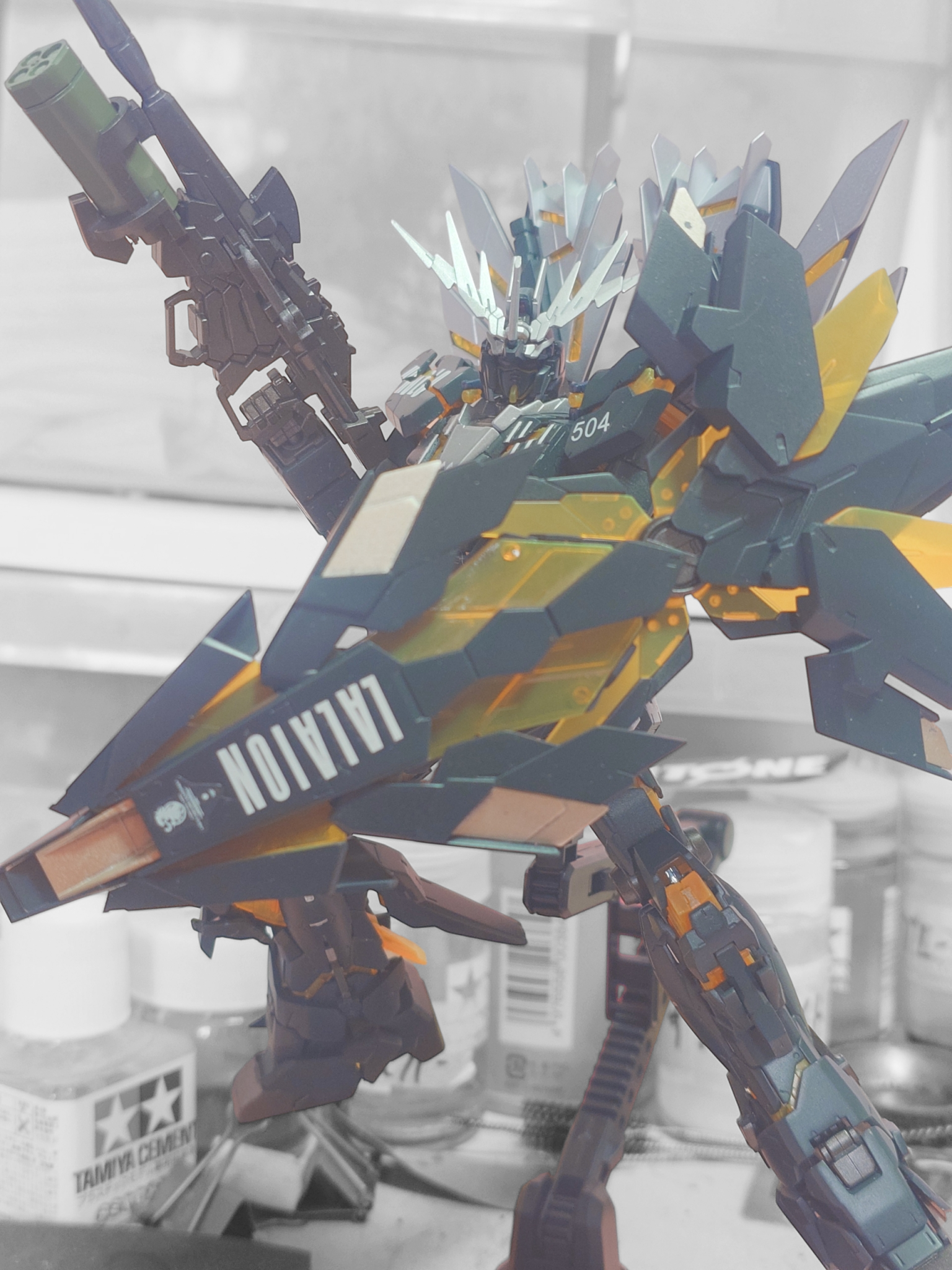 アームドアーマーDE?には獅白ぼたんさんのLALAIONを水転写デカールと付属デカールのライオンマークを貼ってます。シルバーっぽいのはシャンパンゴールドでゴールドのアクセントにしてます。