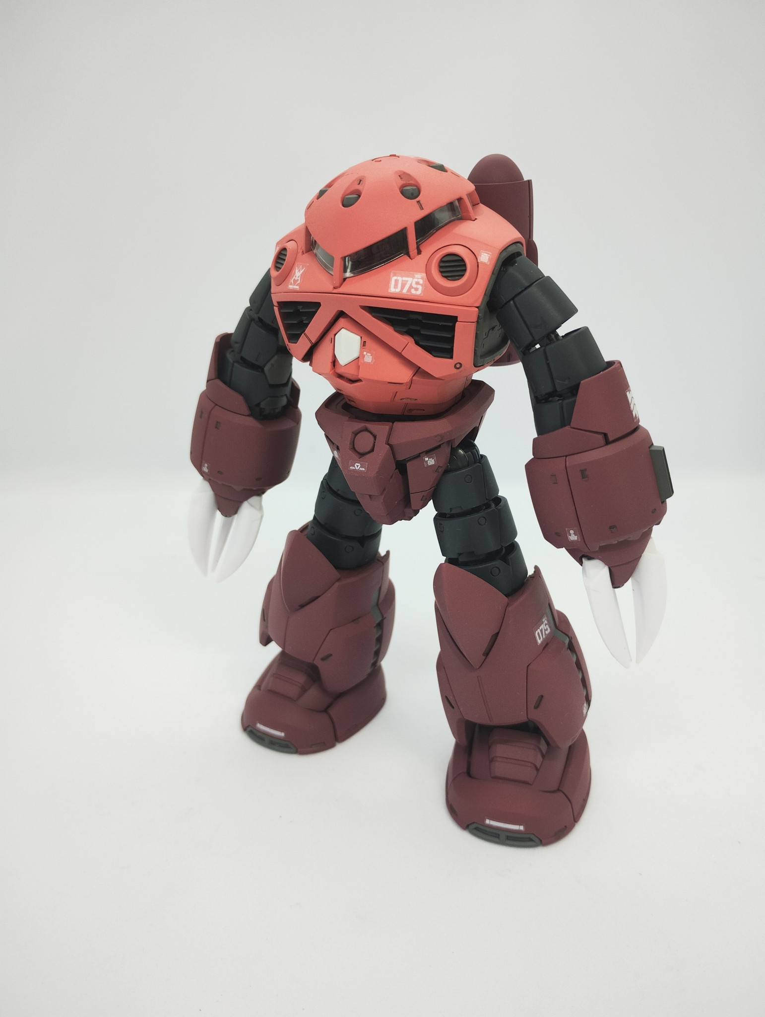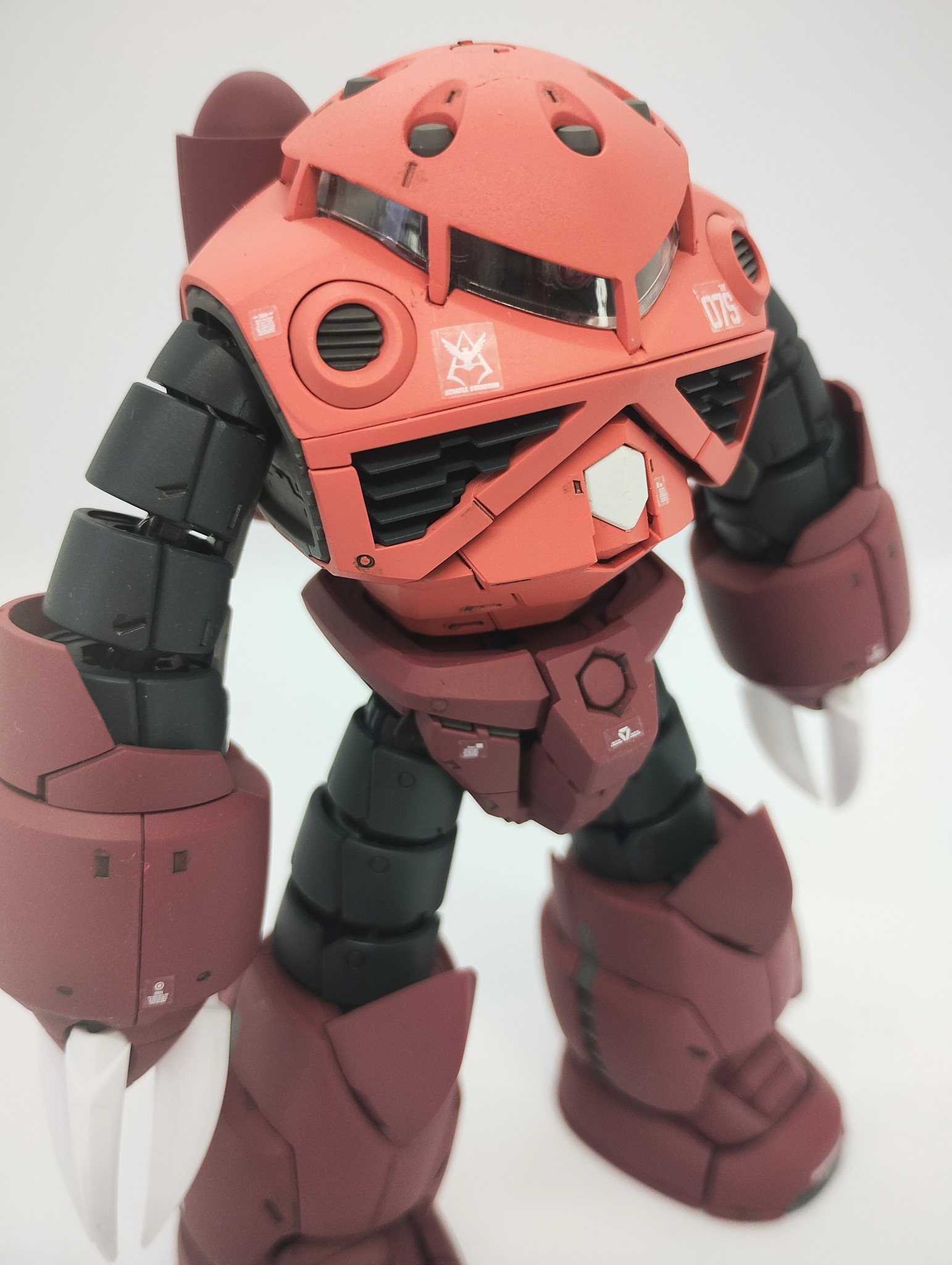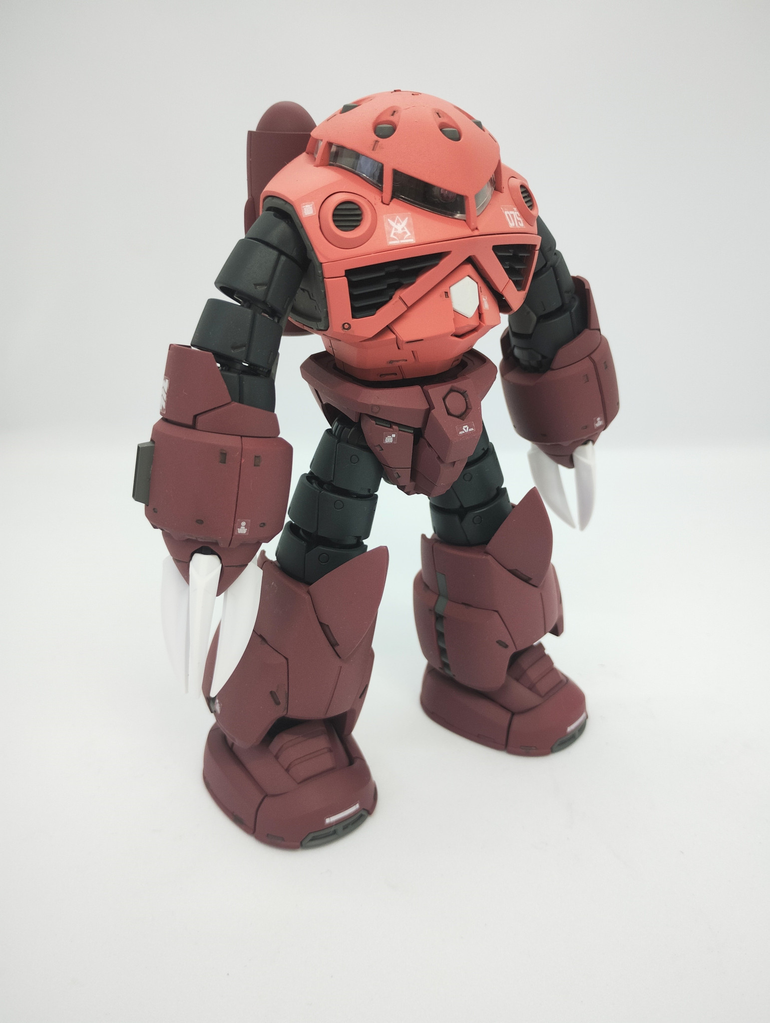 塗装はクレオスラッカーにて。最近シャアのピンクが直球ピンクぽい感じの色指定になっている気がするので、『シャアのピンクはサーモンピンクやろ!』と調色。ちょっと新鮮すぎるサーモンのピンクになってしまいました。もうちょっと彩度下げ明度上げしないと、他の色に比べ鮮やかすぎたかなと。いつもならメタルカラーで色分けする所なのですが、『バリバリ水の中入るし、なんだったら塩水にも入るのに、地金色だったらサビん?きっと全パーツ防錆塗装とかしてるはず』と思って思いとどまりました。塗装も上手くいったので、満足。