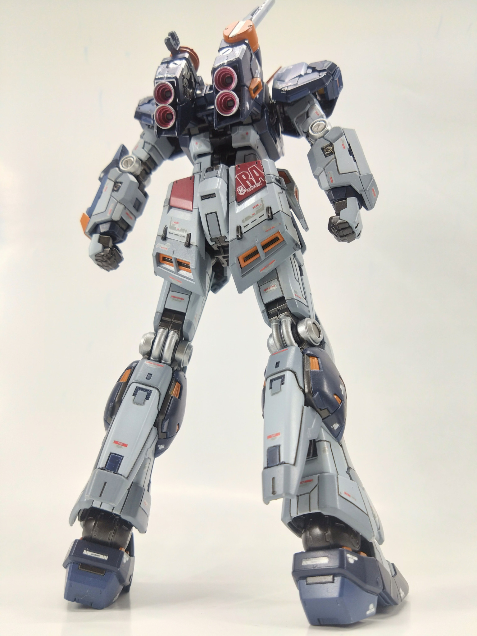 RGなので元々細かいパーツに苦戦しつつも、スジボリと色分けを各所に施しました。ボディカラーのホワイトを青みがかったグレーにして全体的に暗めのカラーです。