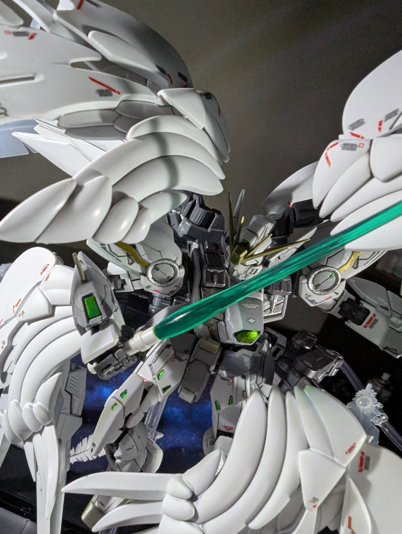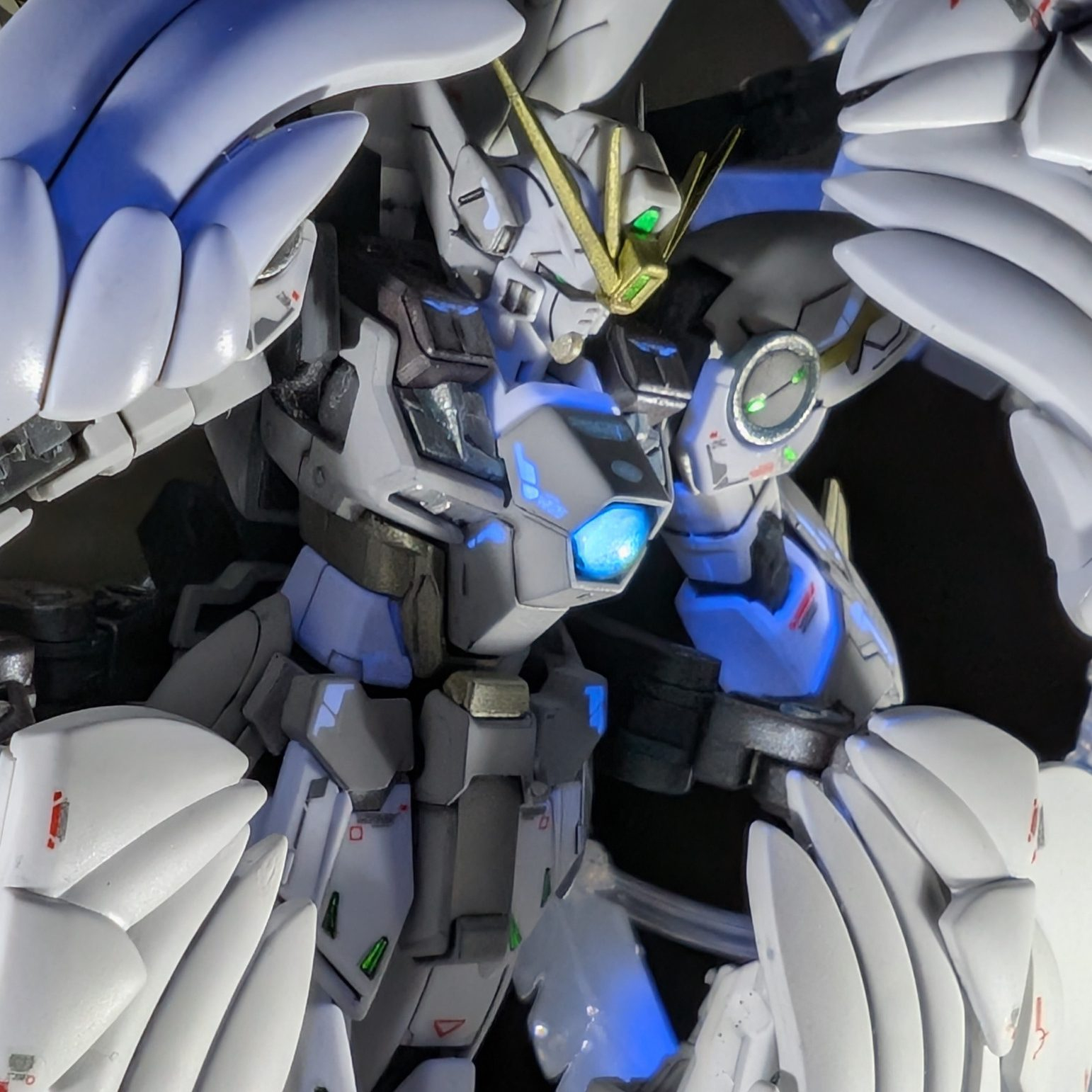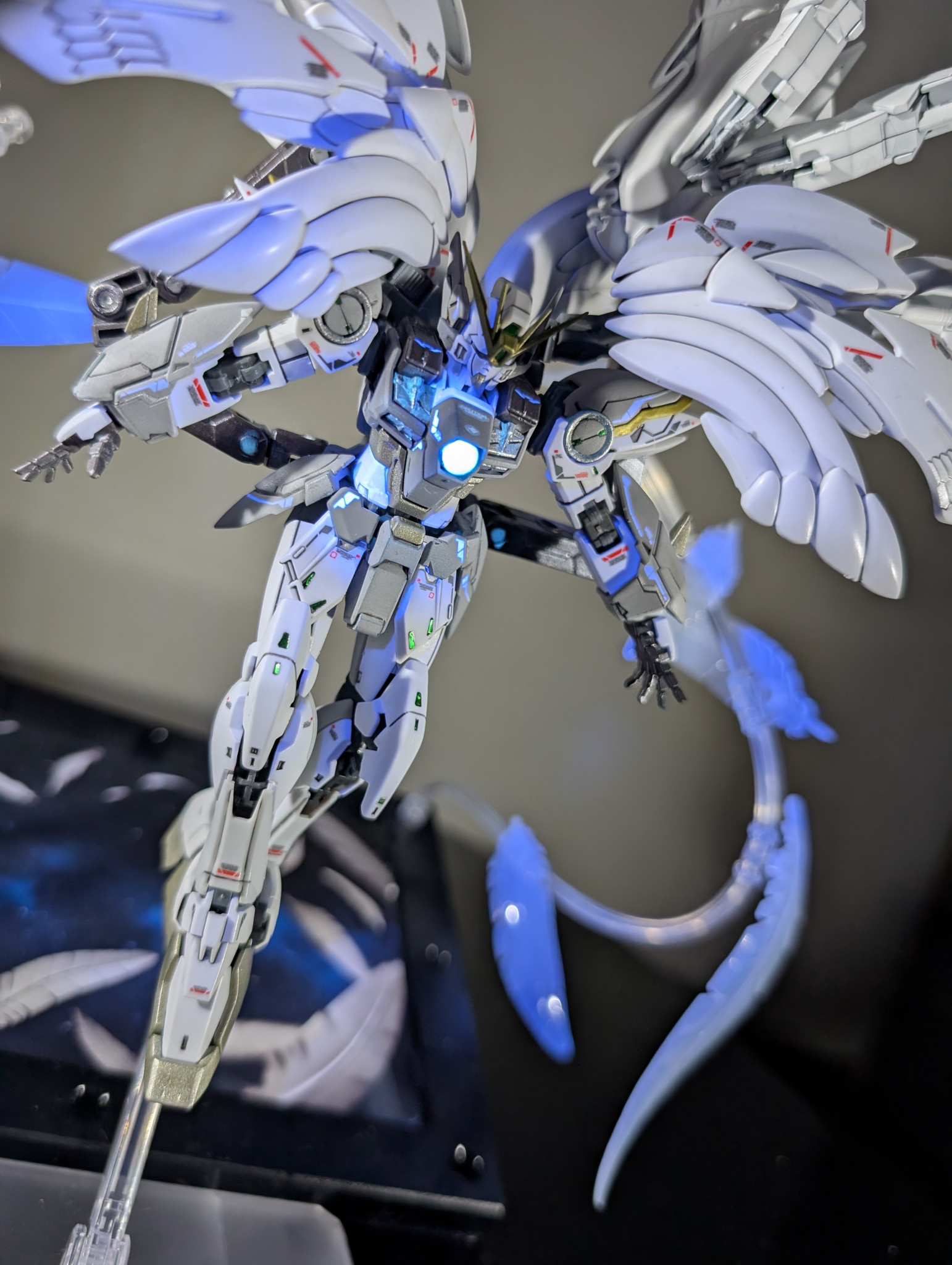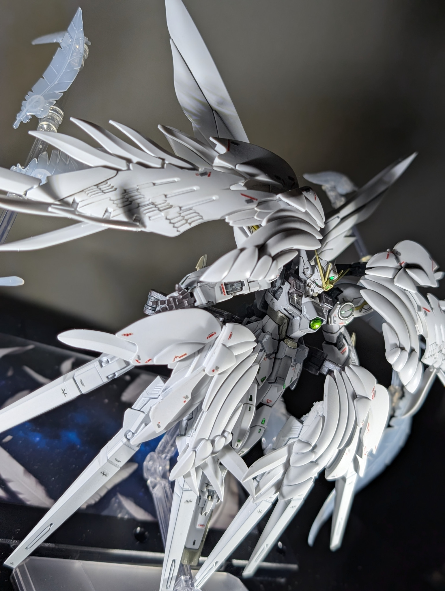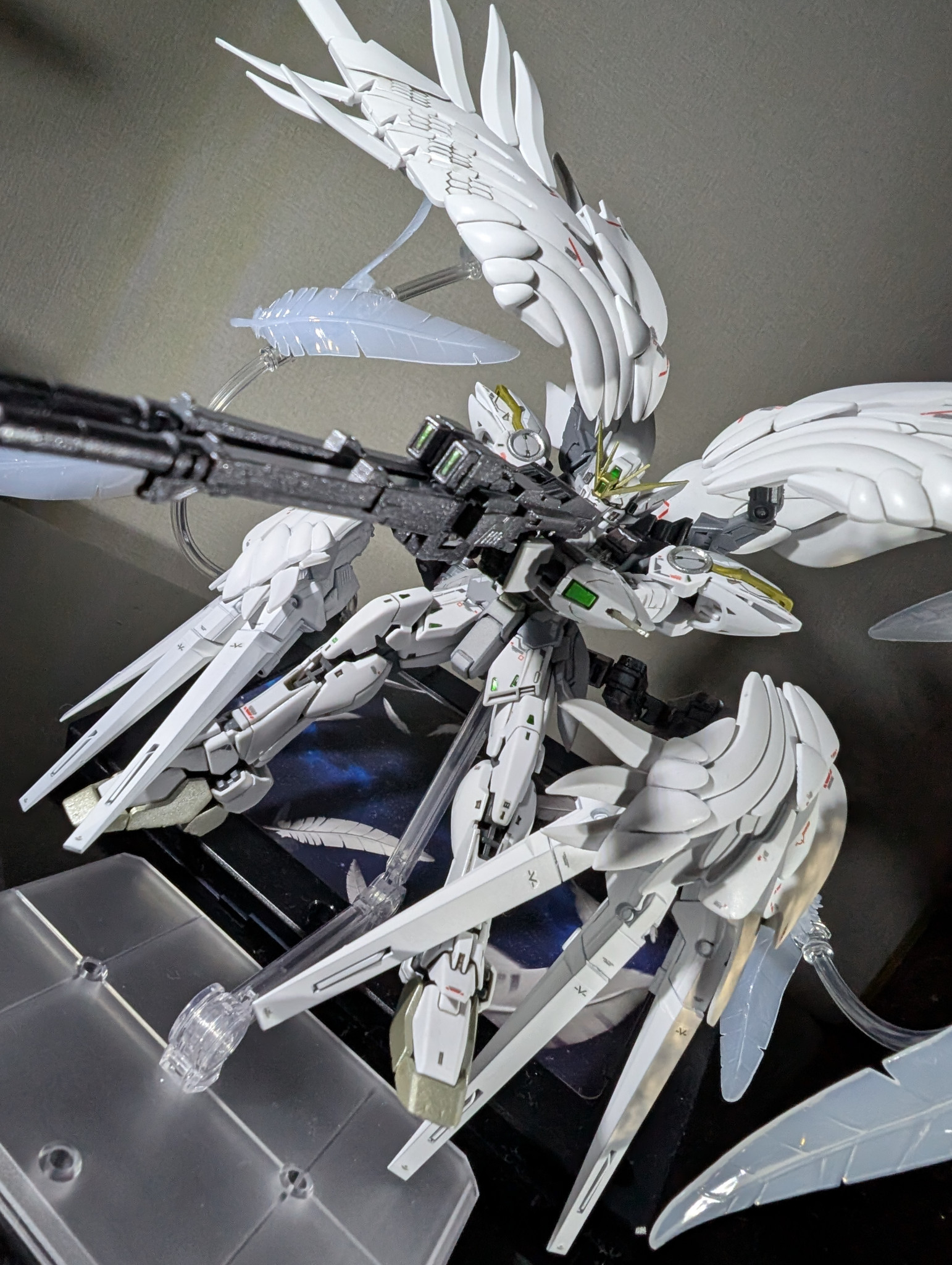 以前からスノーホワイトが欲しくかったのもあり、RGウイングガンダムゼロEWをスノーホワイトっぽく塗装し、セラフィムユニットは自作で再現しました!自作ゆえに既出と違う形状になってますが温かい目で見て頂ければと思います。