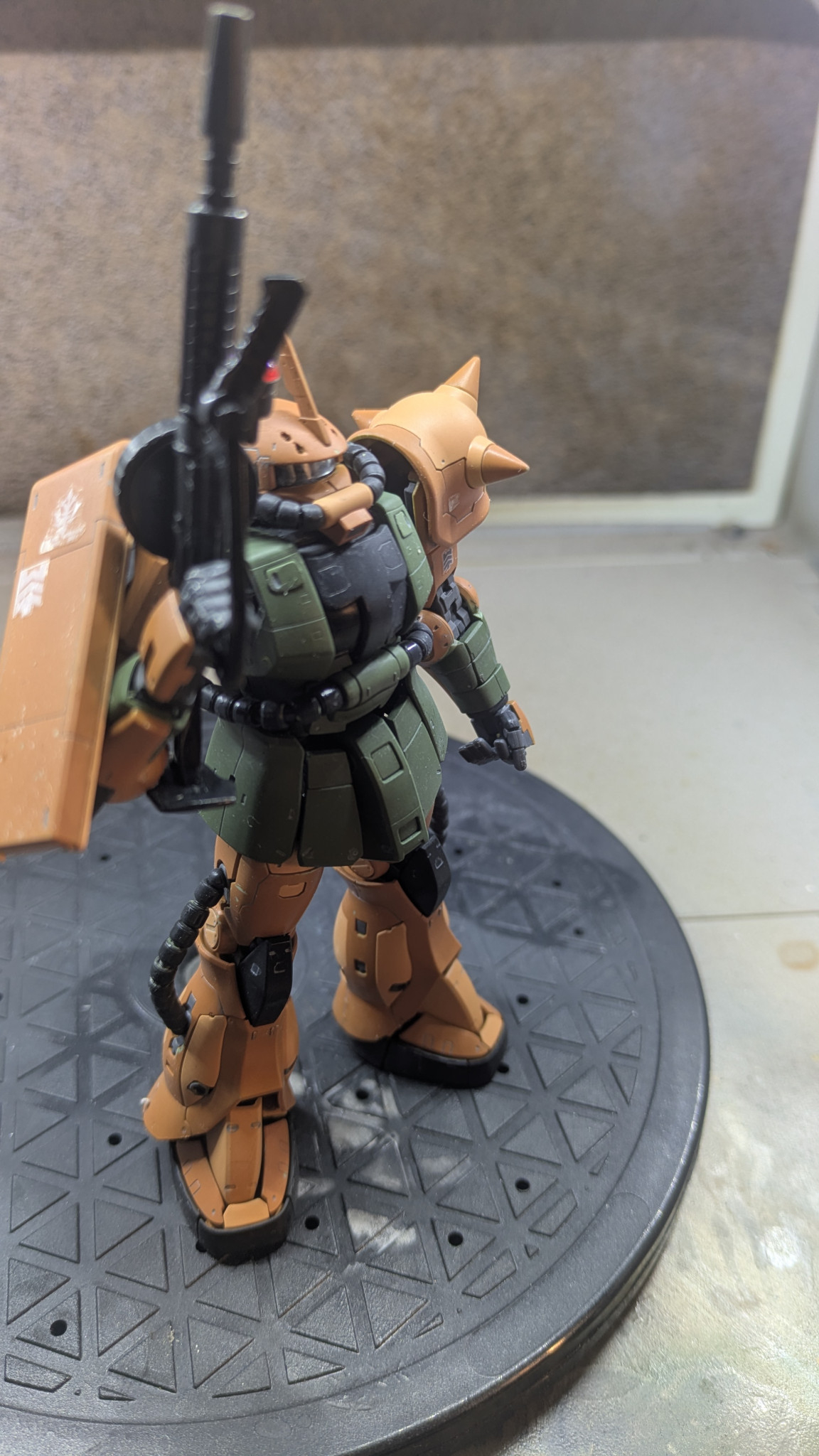 仮組み中に左足股間接軸がポッキリいくし、ポージングは、ザクマシンガン持たせるのに、指パーツがポロポロ取れるし、マシンガンの保持力ガタガタやしマシンガン持たせるのに、1時間半位格闘しました。😅