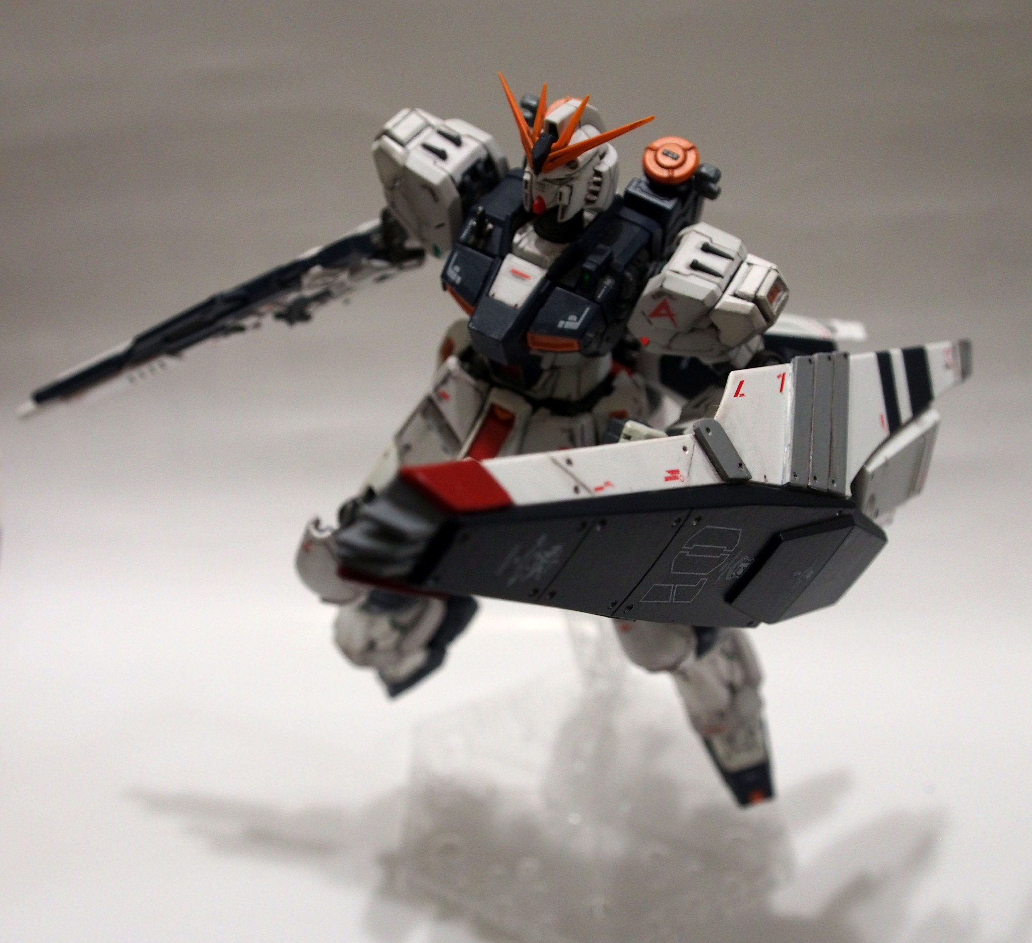大型シールドについて、HWSから剥ぎ取った武装はHGのものなので、プラバンとスジボリにてRGの本体となじむようディテール追加。さらに、HWSの腰前部フロントアーマー部分を転用し、縦の上部隙間を埋めるように配置しました。殴り合いにも使えるよう、盾の先端に衝角を装備。盾の上部に追加したバーニアを吹かしながらえぐり込む、といった格闘もこなせるという脳内設定。