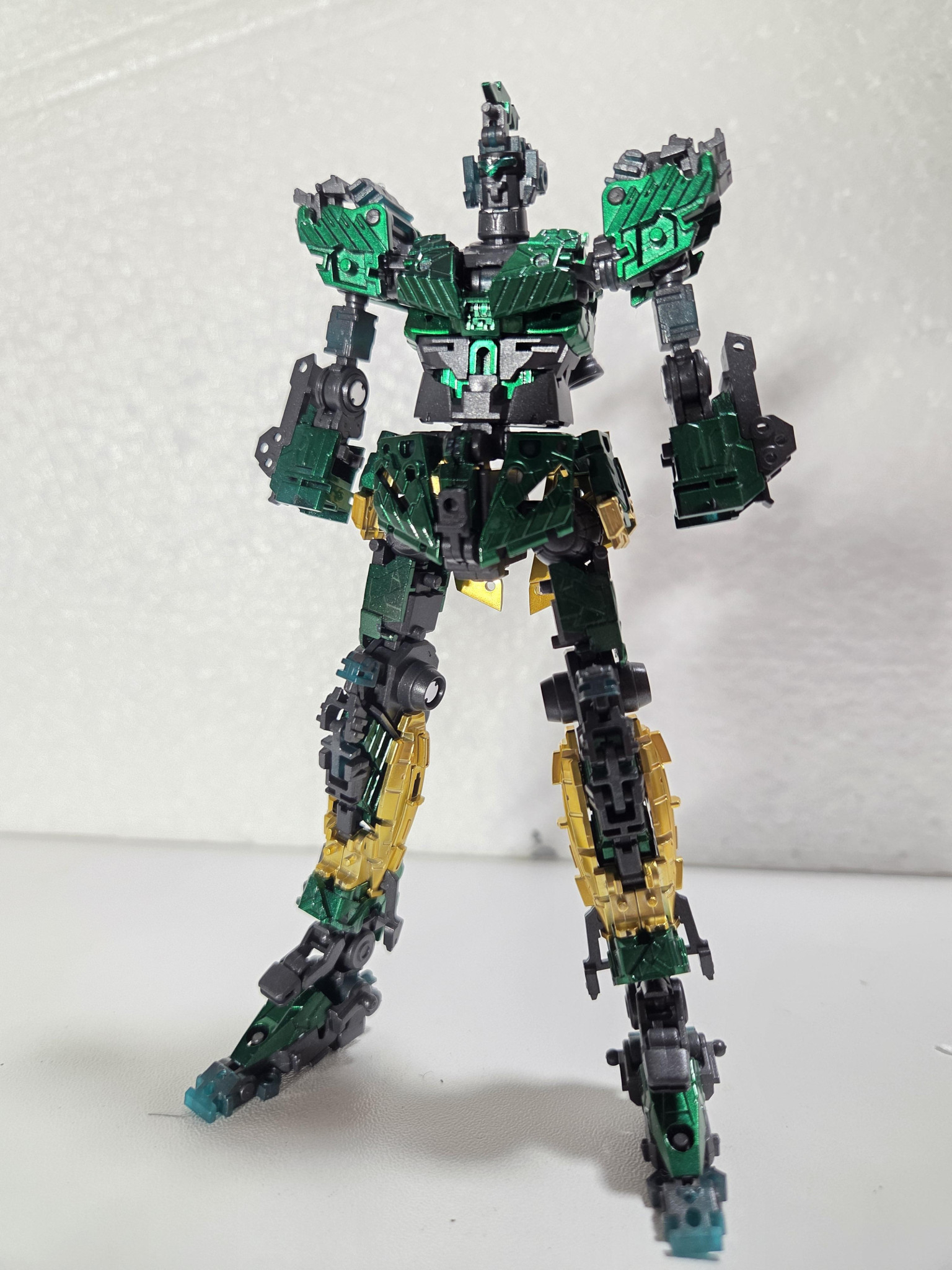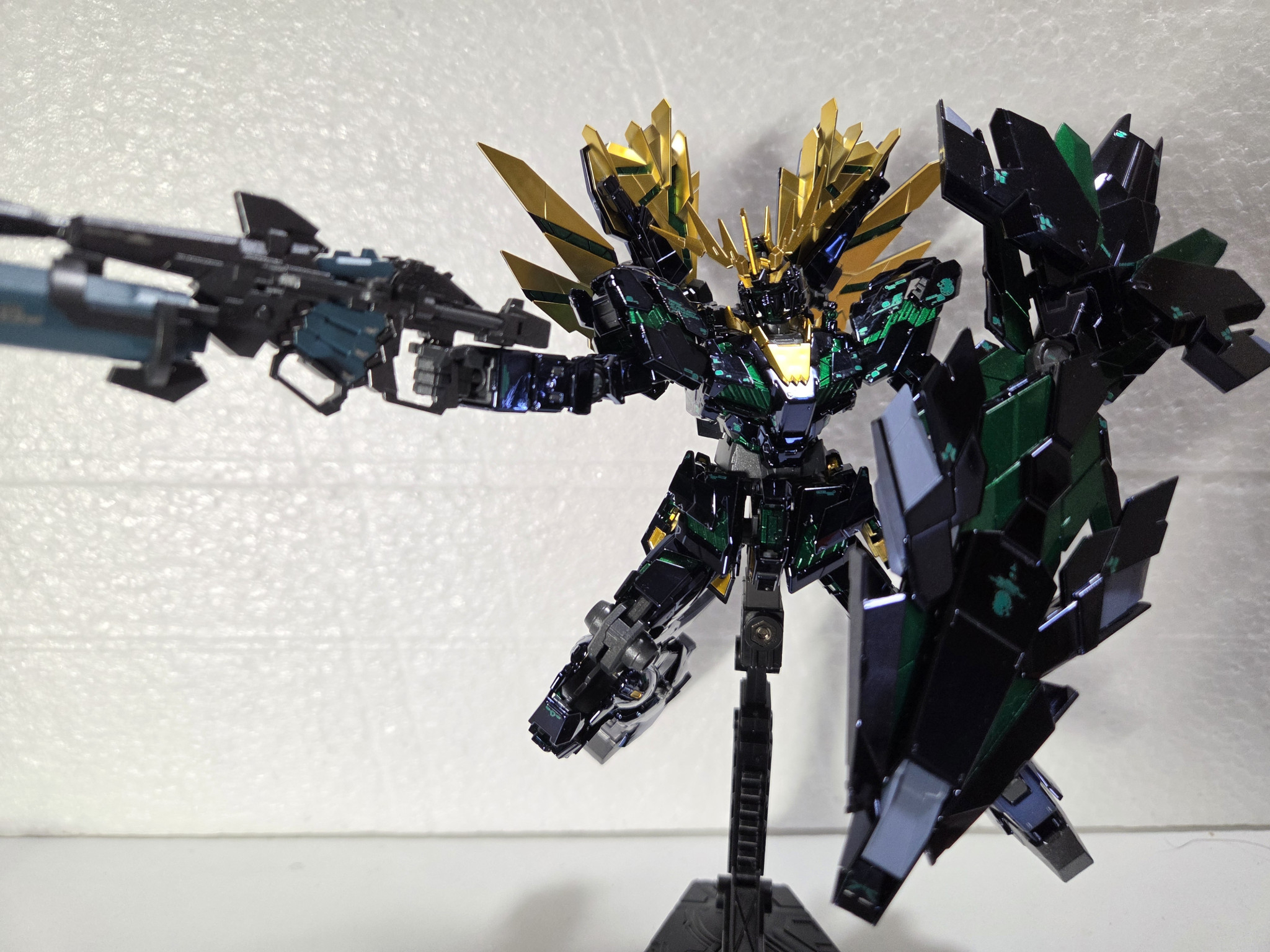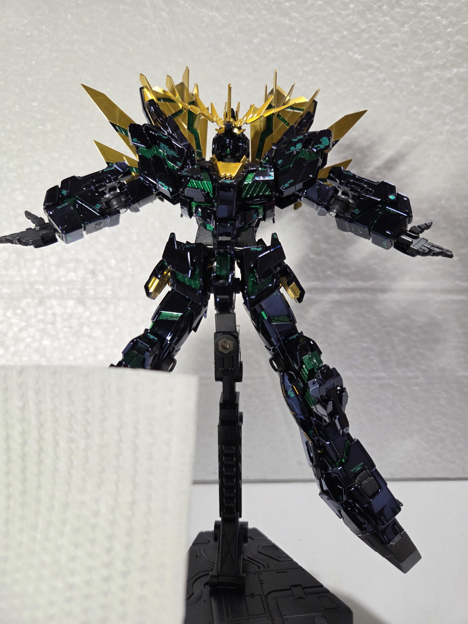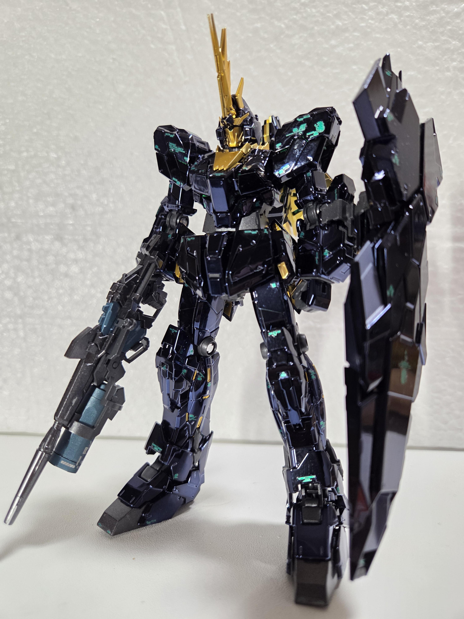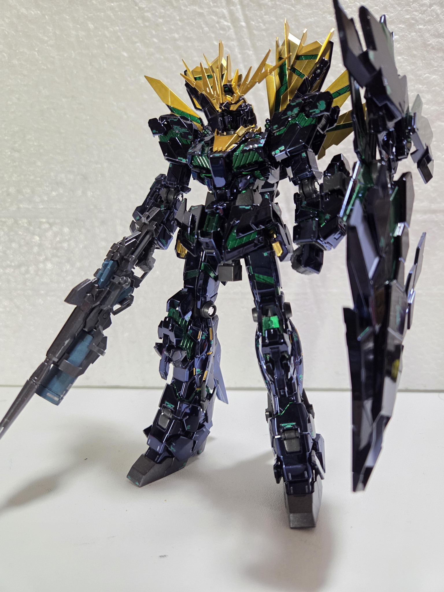 立ち姿です。サイコフレームは緑のキャンディ塗装で他はメタリックにしています。またブラックライトで青緑に光るようにしました。やっぱりサイコフレームは発光してこそと思っているので。