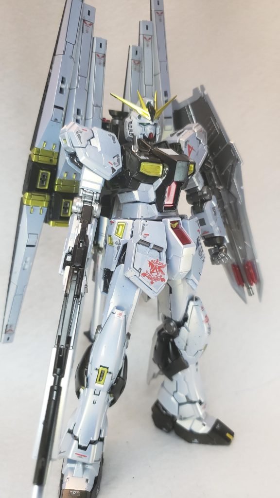 U.C.0093年ロールアウト[5]。アナハイムの組立工場では、νガンダムの各部の試作の為の工作機械が稼働していた。基本作業は、金属を使わない加工と組立作業が中心で、研磨などの音を出す作業や危険な科学薬品を使う作業を含めて隔離されたブース内においてロボット化によって行われた[6]。Ζガンダム時代の基本設計があったために工具の半分以上は流用可能で[注 1]、 アムロが初めて、アナハイム・エレクトロニクスに視察に来た時、νガンダムの製造準備がかなり進んでいたのは、ブライト・ノアとラサで指揮をとってくれたジョン・バウアーの力である。アムロの提案をどの程度組み込むかというレベルで、かなりの討論があったものの、まったく新しいタイプのMSを製造するのではなかったから、それが建造のスピードを早くした[6]。 実質3か月という短期間で完成に漕ぎつけた