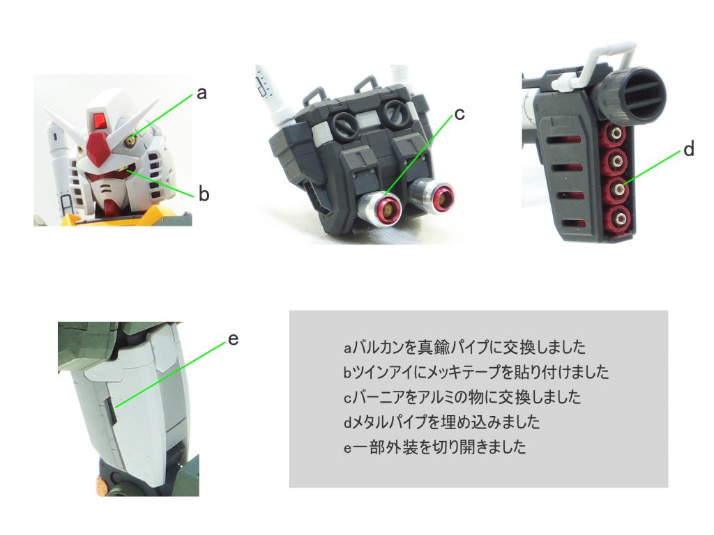 RG ガンダムをラインをマスキング塗装してリアルタイプカラーとして 製作してみました。頭部バルカンやバーニアを交換しました。