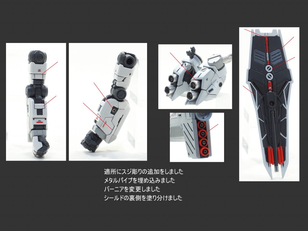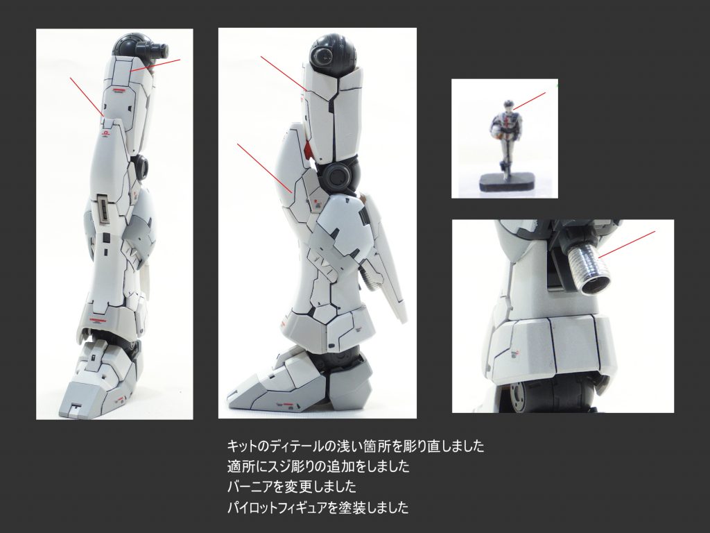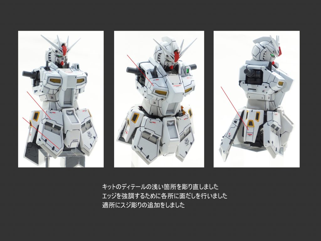 RG νガンダム ロールアウトカラーにて製作しました。 キットのディテールの浅い箇所の彫り直しやエッジを強調するために面だしを行いました。適所にはスジ彫りの追加をしました。