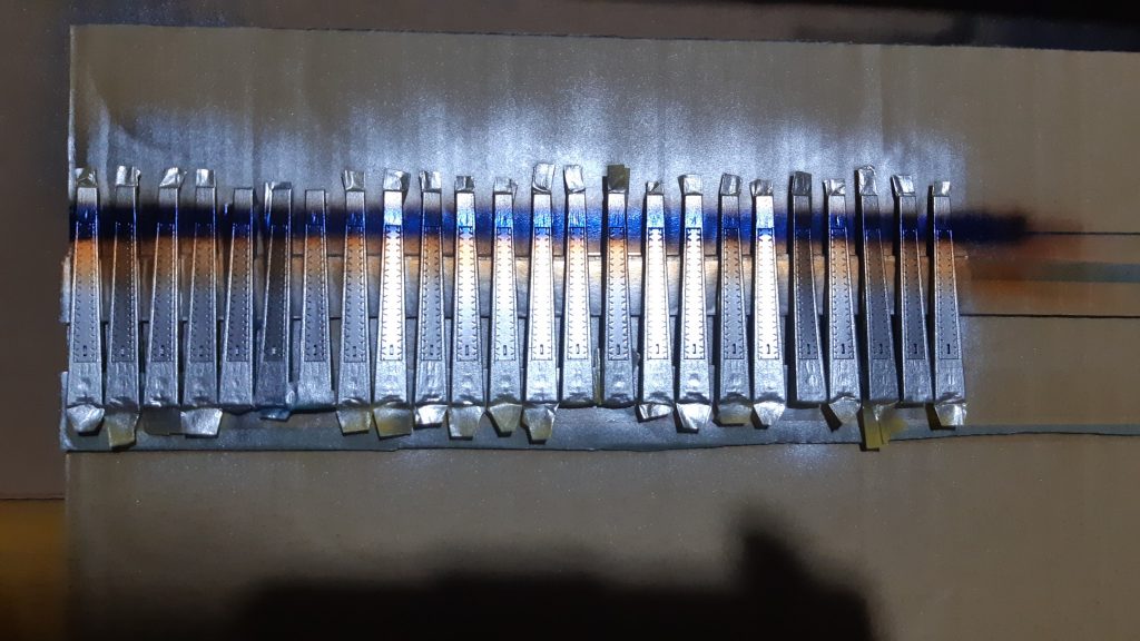 上下の小さい塗装部分はスターブライトシルバーの上にクリアオレンジを希釈多めにして縁に塗料が寄るように筆塗りです