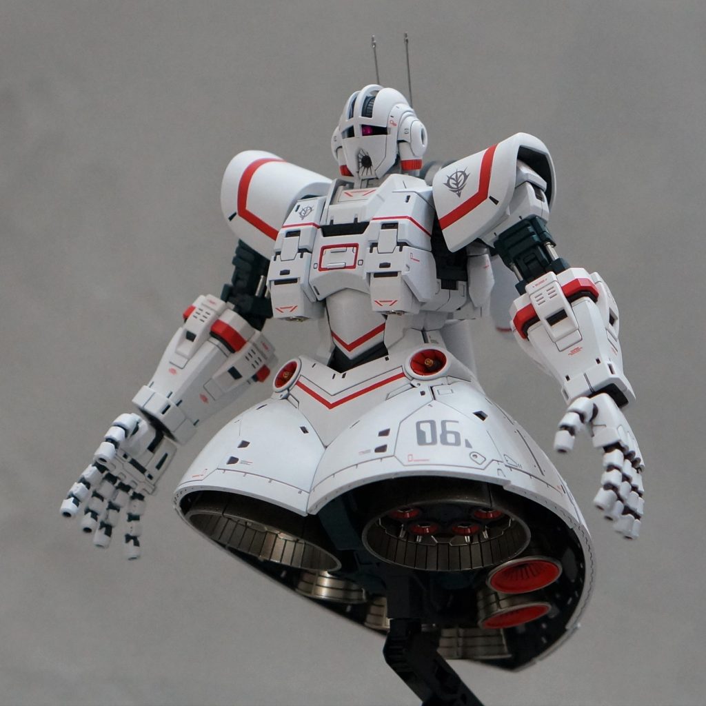 カラーリングはタコザクの白に特徴的な赤のラインを加えています。頭部のアンテナ、肩パーツの形状もタコザクに寄せてプロトタイプっぽさを出しています。