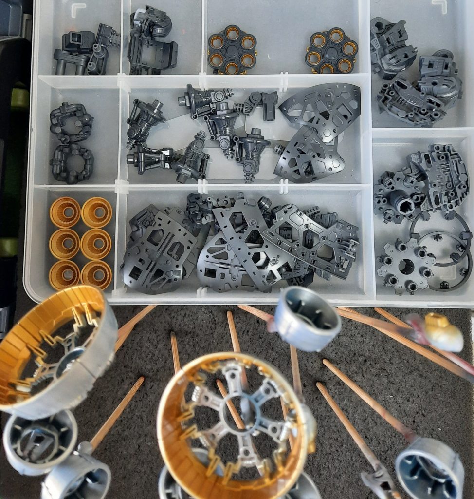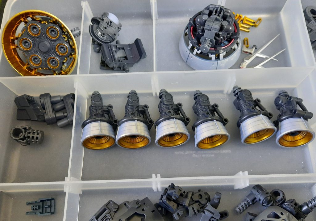 シルバー立ち上げからのクリアーホワイト塗装で仕上げたバーニア群は角度によって違った色合いに見えます。