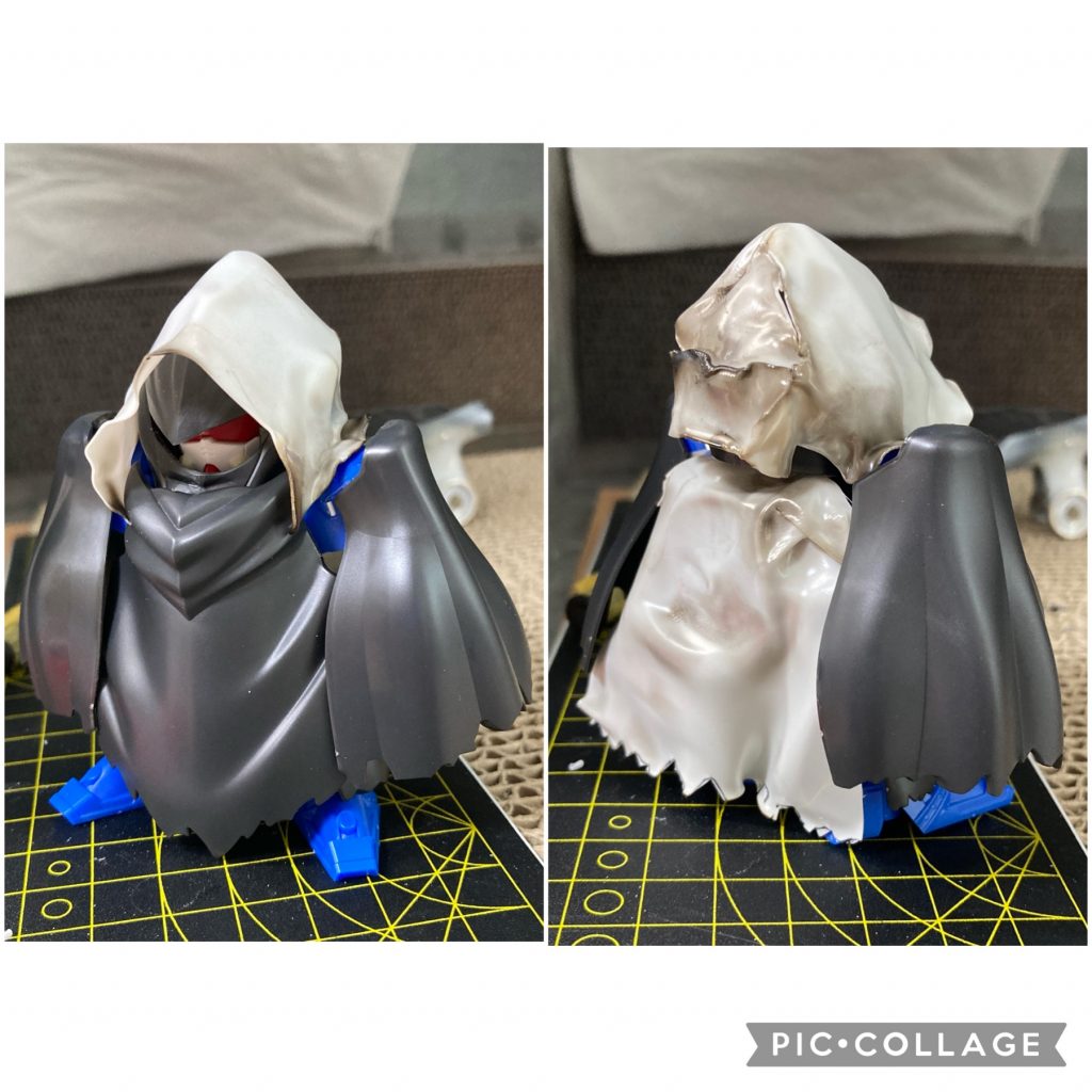 頭部はフードにしたかったのと背中のマントも欲しかったので、0.3mmプラ板をロウソクであぶって作りました。