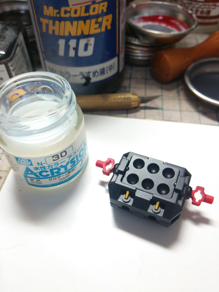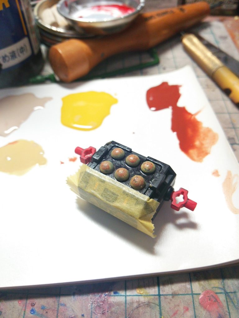 今回最大のこだわりがこのたこ焼きの塗装です。アクリジョン筆塗りの後、HGUCギラズールとLGBB殺駆頭の緑ランナーを削って粉上にして青のりに。