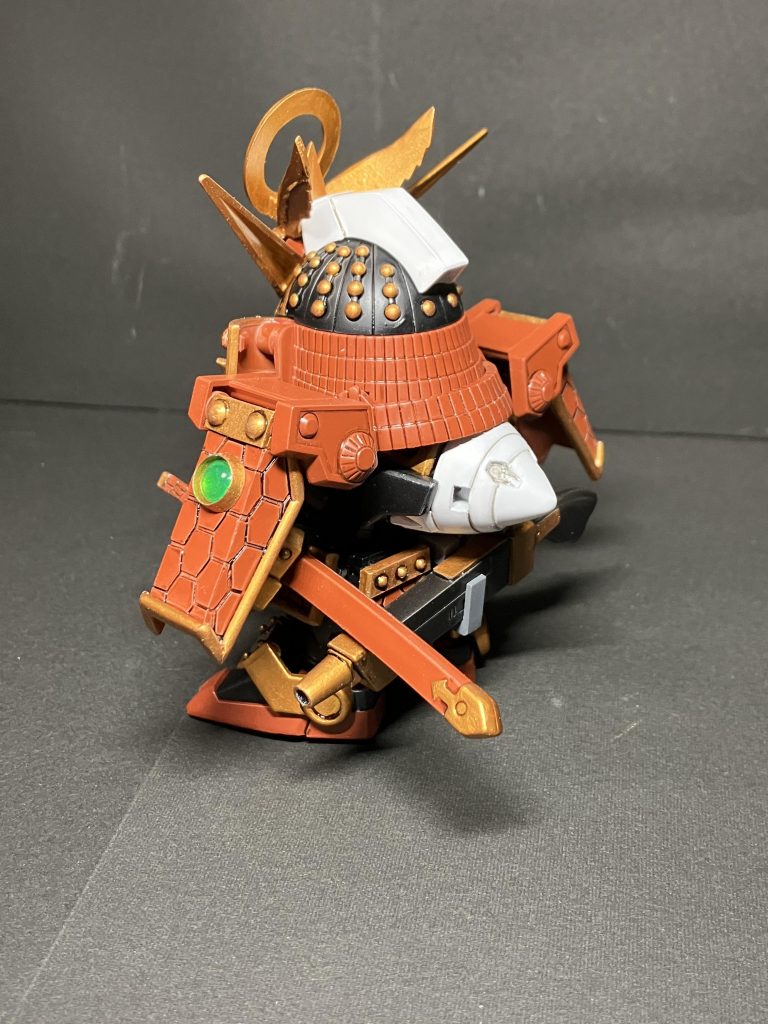 レジェンドBB武者頑駄無とOガンダムをミキシングしてオリジナル武者を作りました。可動指を制作して武器を握れるようにした他、鎧も一部スクラッチしています。