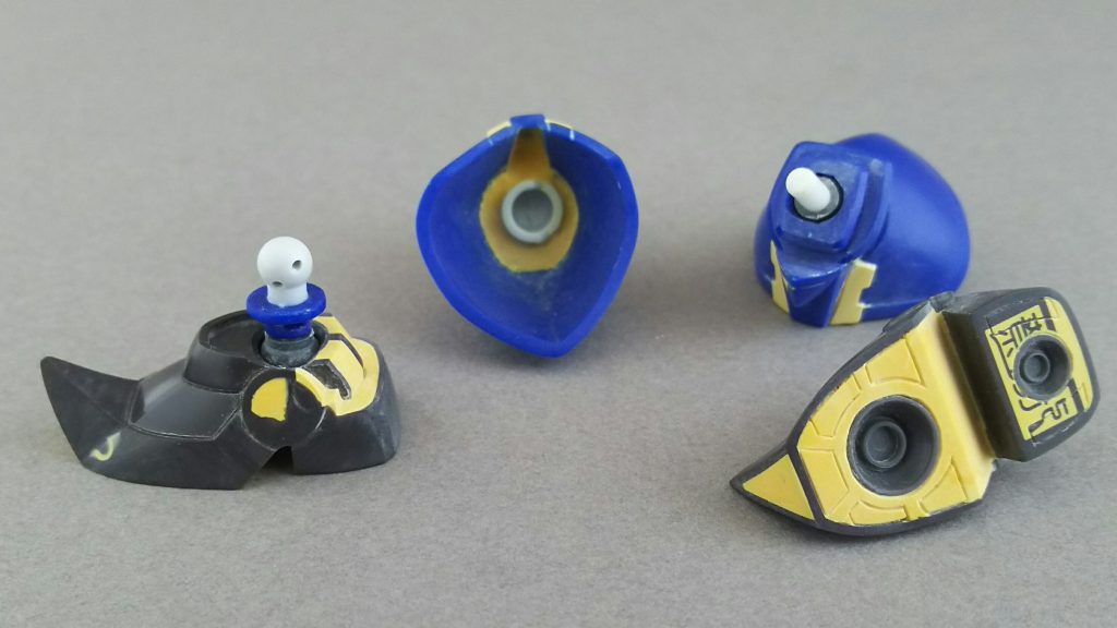 槍は後の展開でGP02に繋がる事を考えアトミックバズーカをモチーフにしたのと、盾は黒魔神の細胞が増殖して出来たという設定のため黒魔神のディテールをモチーフに制作しました。