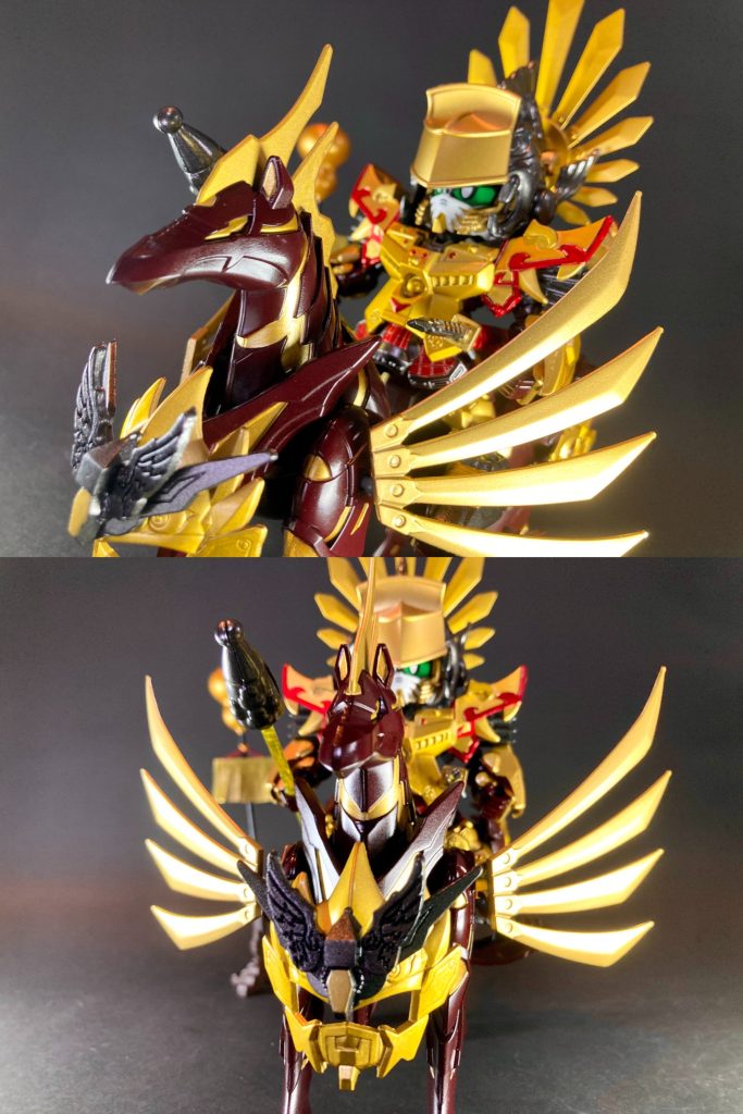 正面の鎧に千生大将軍の兜・大爆面、前脚の肩部に千生盾の四方八方刀をSD戦国伝リスペクトを込めて加えさせて頂きました。