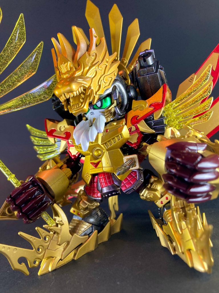 今回もSD戦国伝・武神降臨編のSDWヒーローズ規格化というコンセプトで謙信マスターガンダム、信玄ゴッドガンダムに続く製作で、また今回はヒーローズ素体側のギミックも豊富に盛り込む事が出来て、とても楽しい経験となりました。