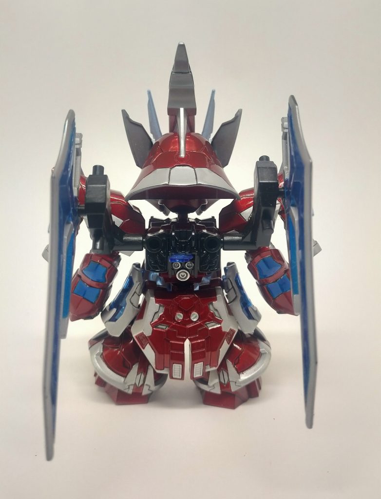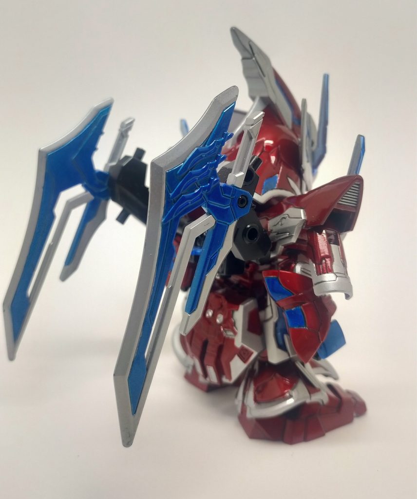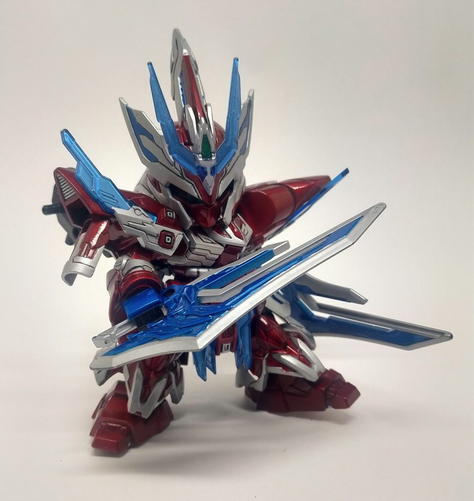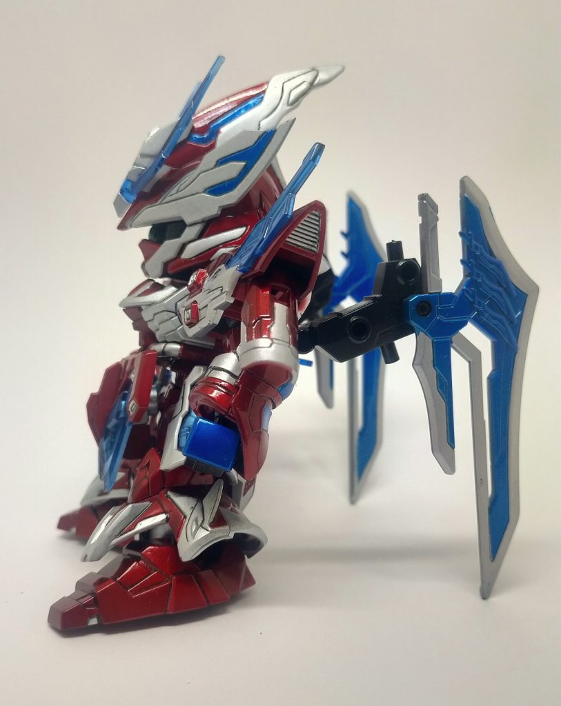 ゴールド部分をシルバーにしてみました。クリアパーツは裏からシルバーを吹いてます。モノアイは黒下地にシルバー、クリアグリーンですが、蛍光グリーンの塗料を使うべきでした。初心者ながら合わせ目消しと赤と青部分のキャンディ塗装にチャレンジしました