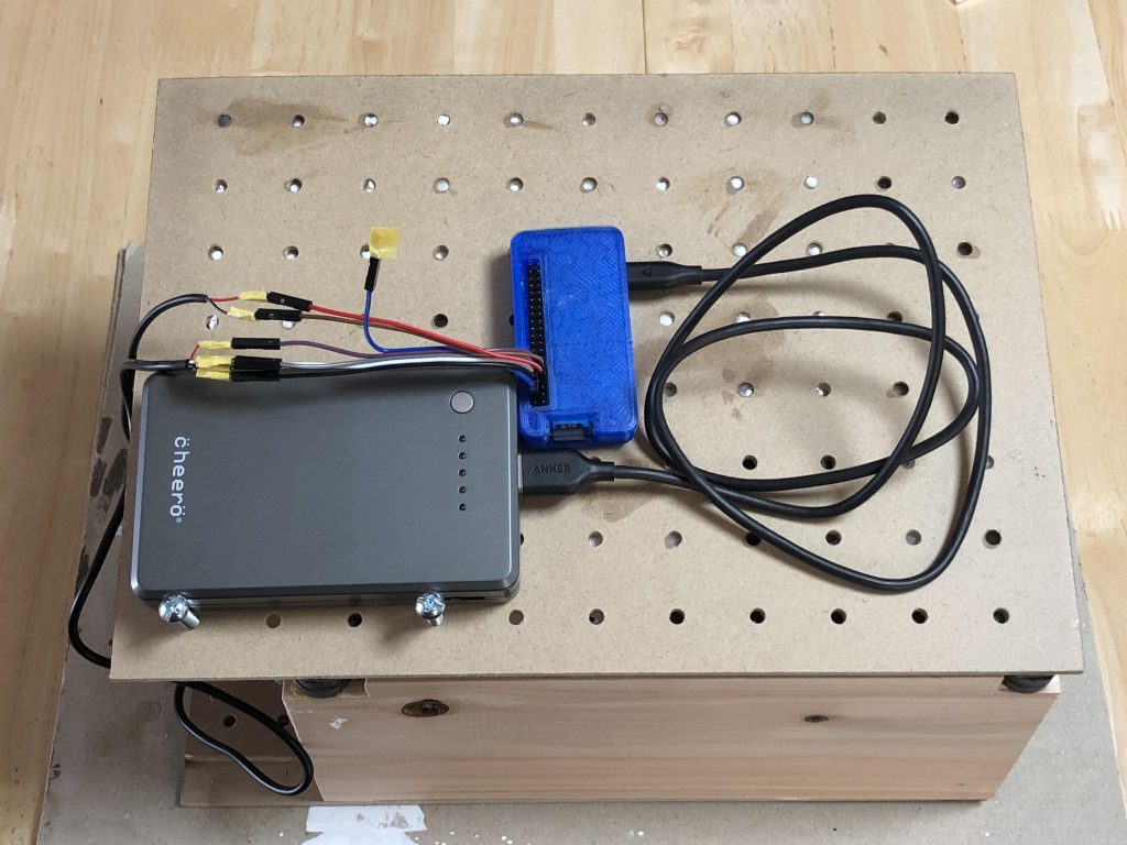 MDF穿孔ボード、発泡スチロール、紙粘土が主な材料です。天板はマグネット式で外すことができます。上に乗っている青色の箱がRaspberry Pi Zero WH(LED制御用のワンボードマイコン)、灰色の箱がモバイルバッテリー(電源用)です。