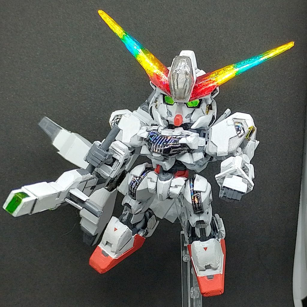3日後、頭部のアンテナのダミー部分をプラ板で作り(UVレジンパーツに複製するために作りました)、ユニコーンの肩のパターンを研磨して新しいものを貼り付け、顔もユニコーンのパーツを使用してより似せました。 キャリバーン