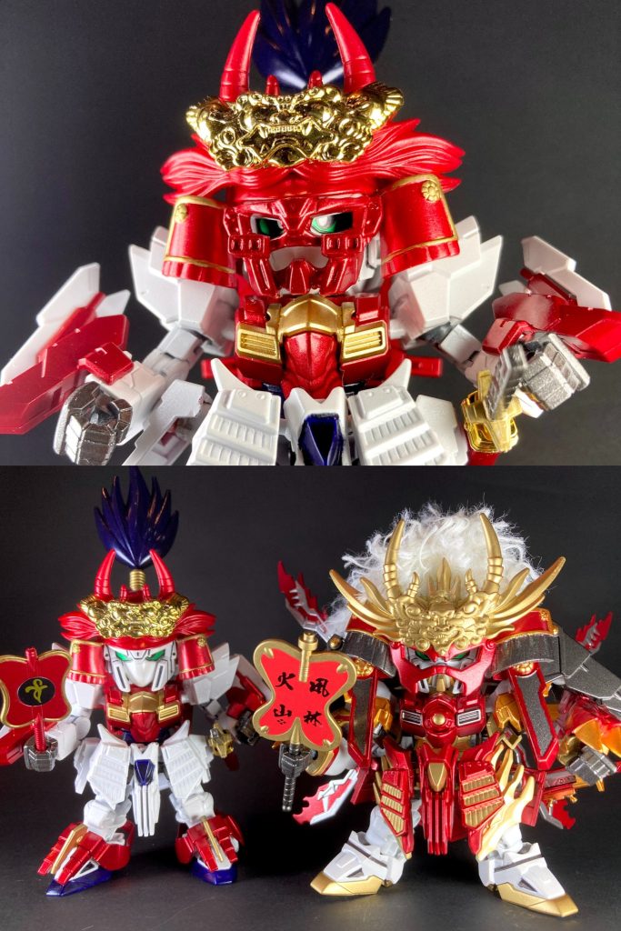 三国創傑伝の張飛ゴッドガンダムを素体ベースに、HG1/144ブレイジングガンダムより特徴的なパーツを取り入れ、SD戦国伝の元祖・信玄頑駄無やLGBB武者頑駄無、信長ガンダムエピオンなどから各種パーツを組み合わせてデザイン造型しました。