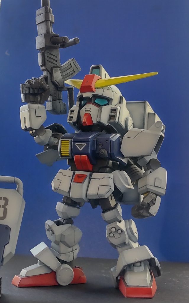 フロントアーマーとサイドアーマーを可動式にする事によって膝立ちのポーズでの180mmキャノン射撃時のポーズを再現可能にしました。黒立ち上げで塗装しました。ランドセル、フロントアーマー、肩アーマーにスジ彫りを追加しました。
