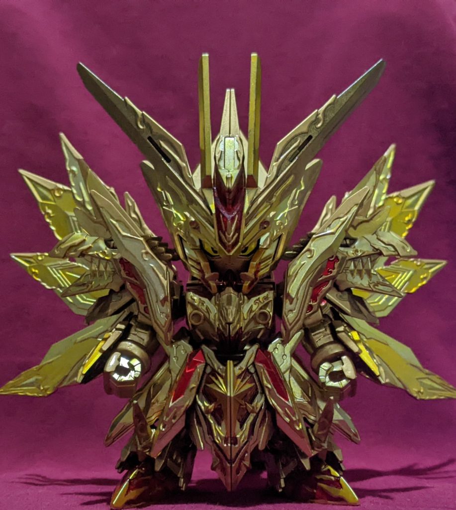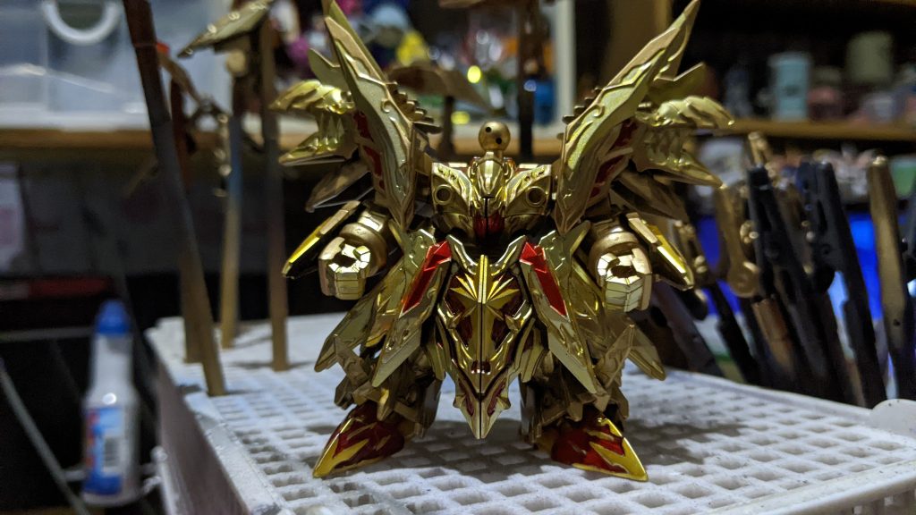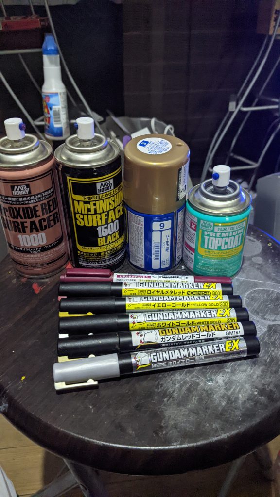 明るいゴールドのパーツには「オキサイドレッドサーフェーサー」を下地に、暗いゴールドのパーツには「フィニッシングサーフェーサーブラック」を下地に、缶スプレーのゴールドを吹き付けてから細かいところをガンダムマーカーの「イエローゴールド」「ホワイトゴールド」「レッドゴールド」「ホロイエロー」を使い分けて塗装しました。