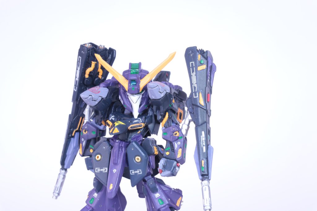 実際のプラモデルのフライルーは顔がガンダムヘッドで首から下はギャプランなのですが、塗装途中でそれに気づいたので、強化型ということでそのまま進めました。