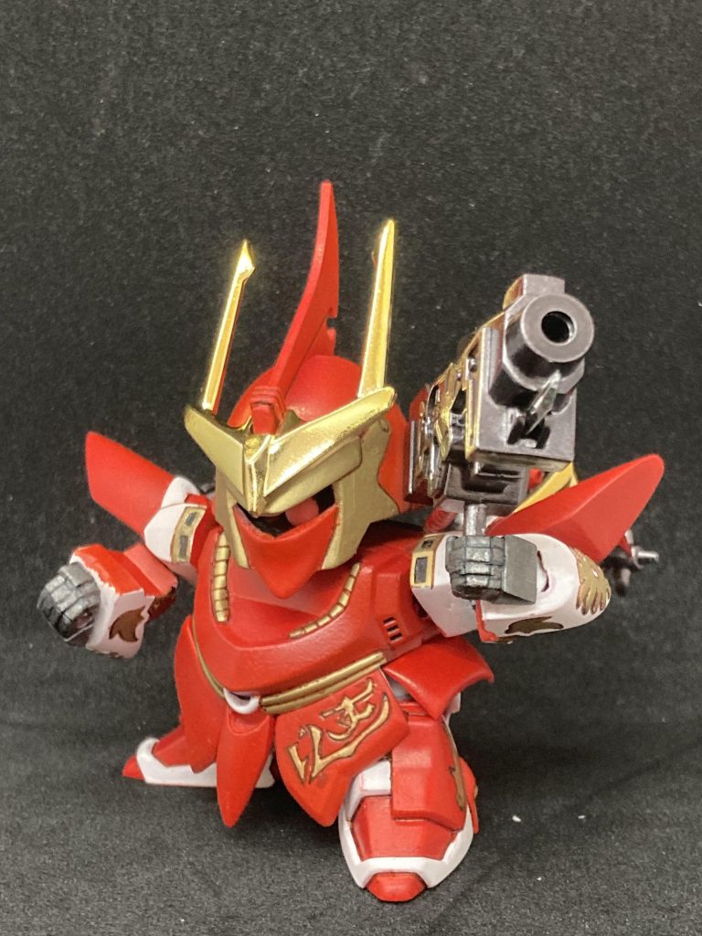SDガンダム烈伝の作例ポーズ。ずんぐり体型をどこまでスマートにしようか悩み、完成まで半年かかってしまいました。結局原型を活かしましたが、SDらしくなって良かったと思っています。
