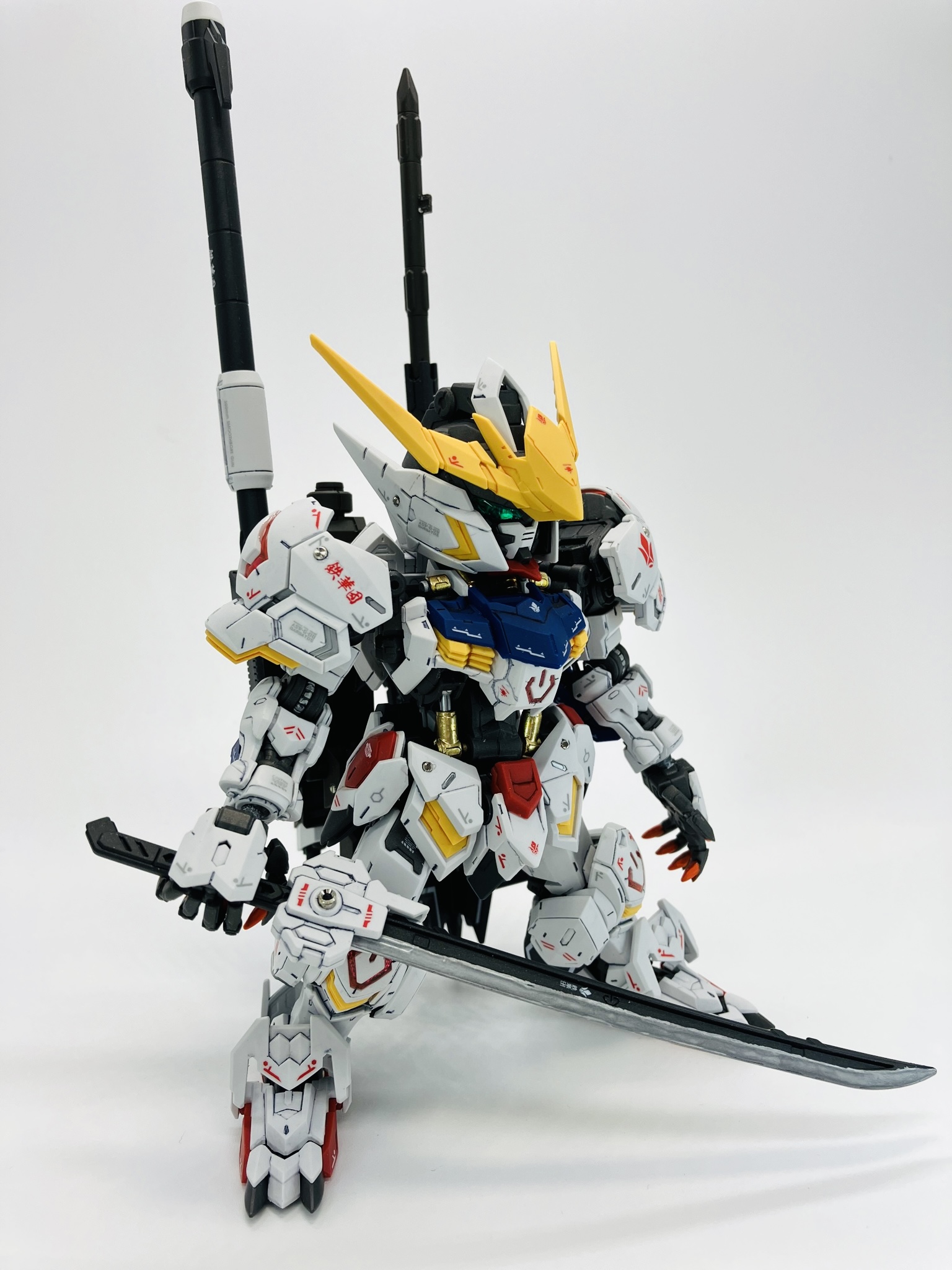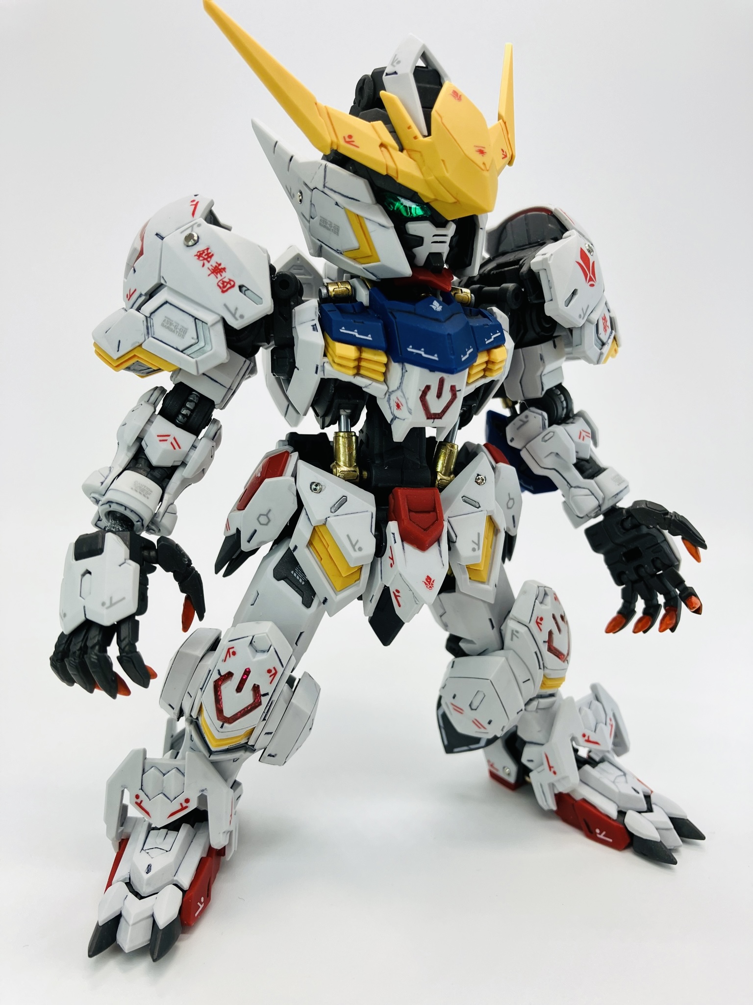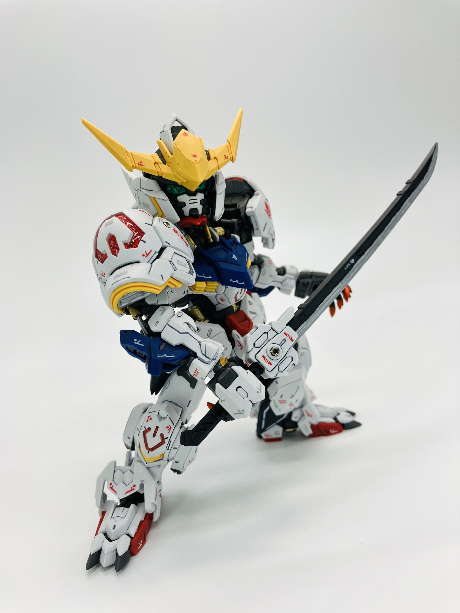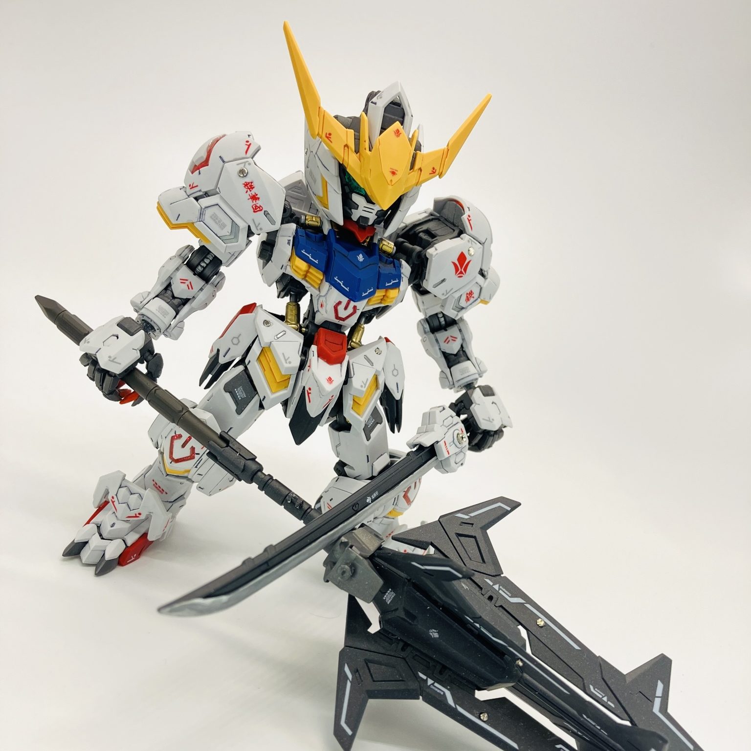 マスターグレードSDガンダムバルバトス、成形色にスミ入れと部分塗装、デカールにトップコートの簡単フィニッシュにメタルパーツのちょいプラスです🥴