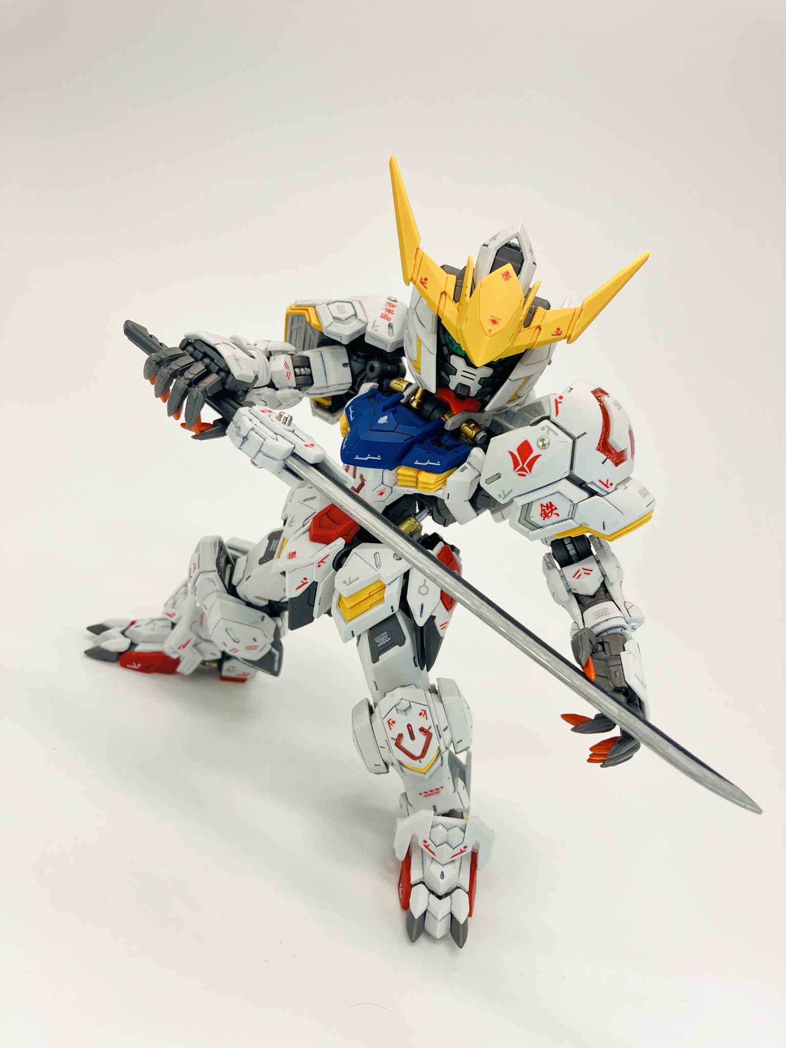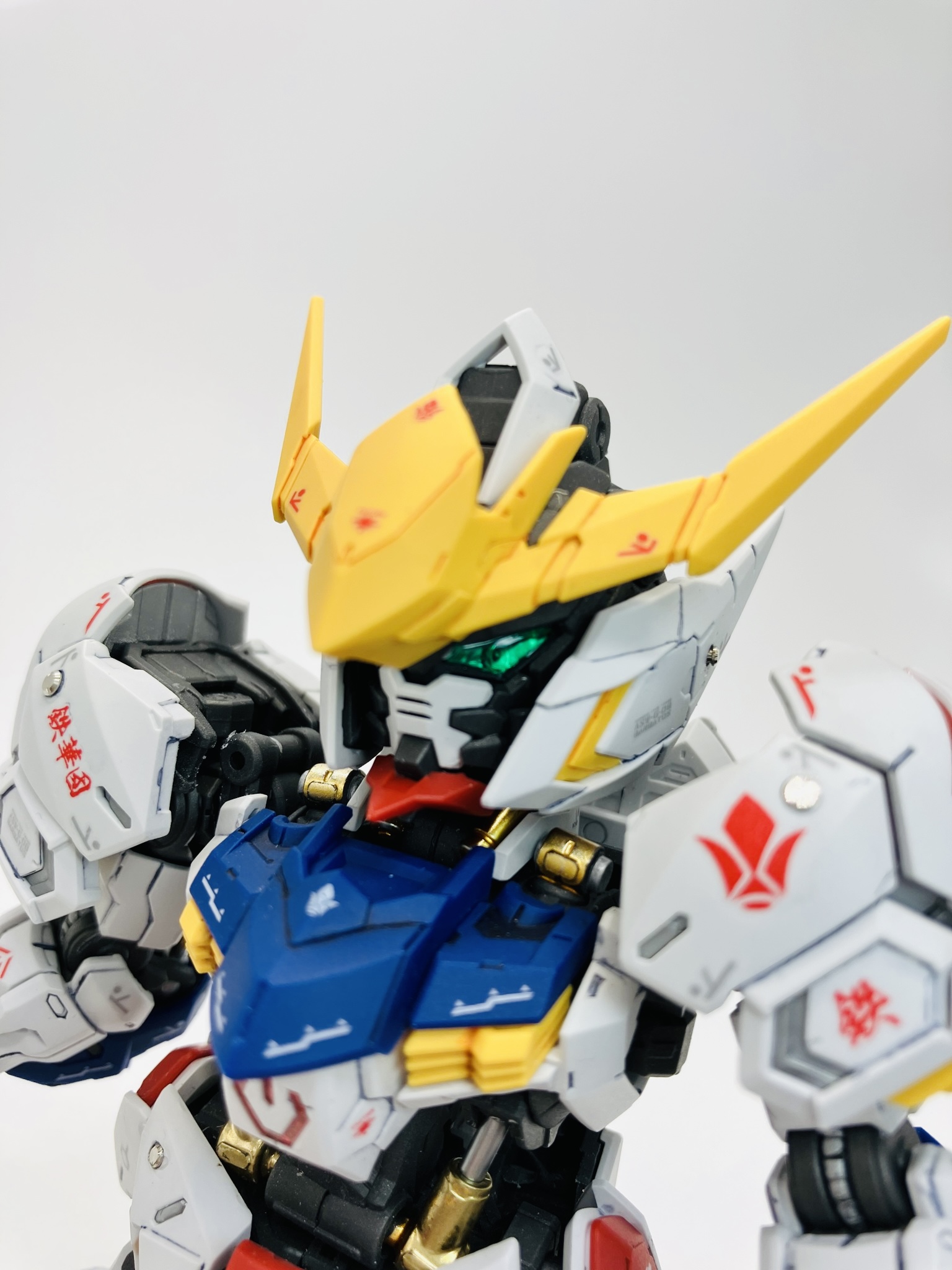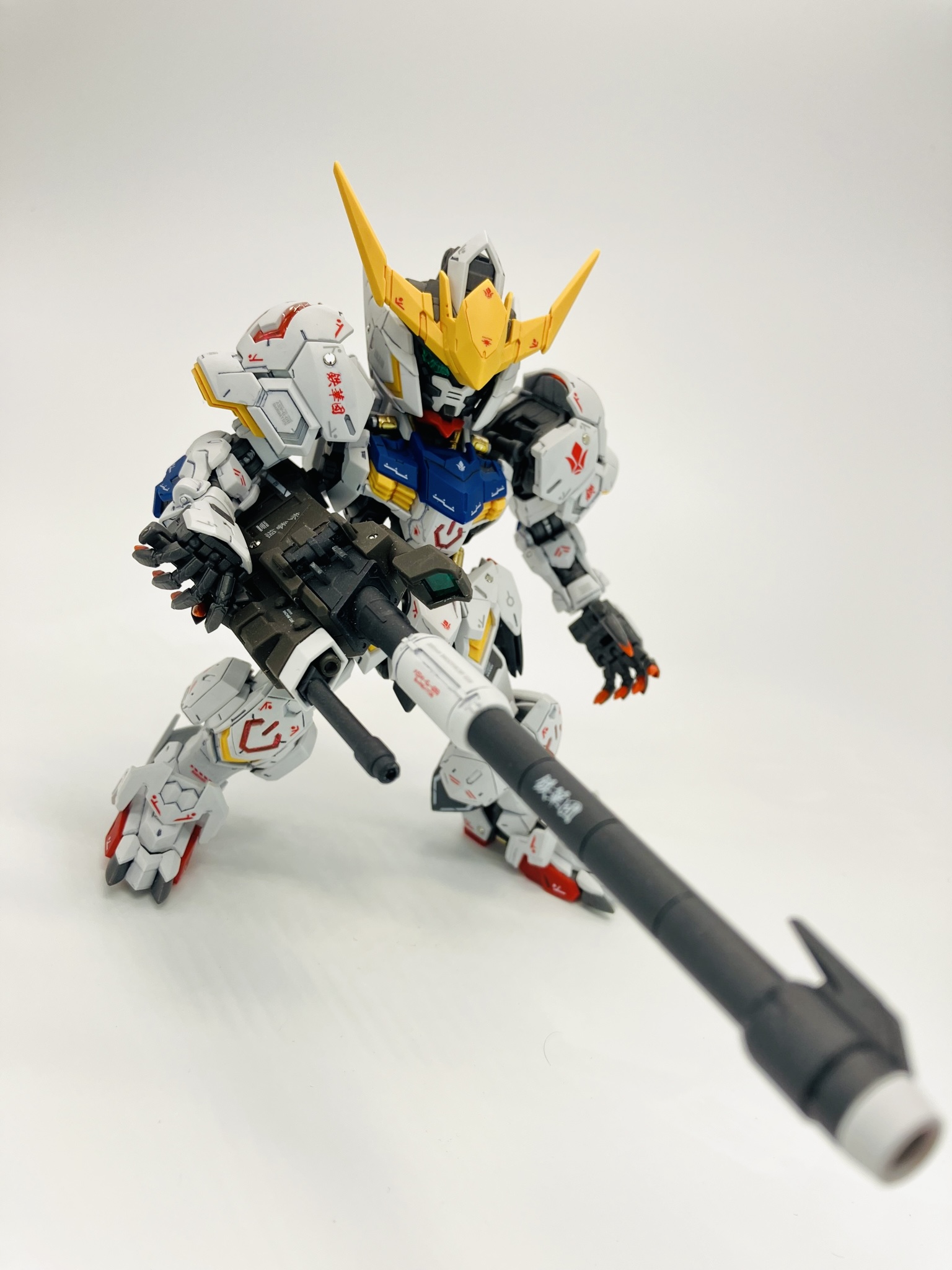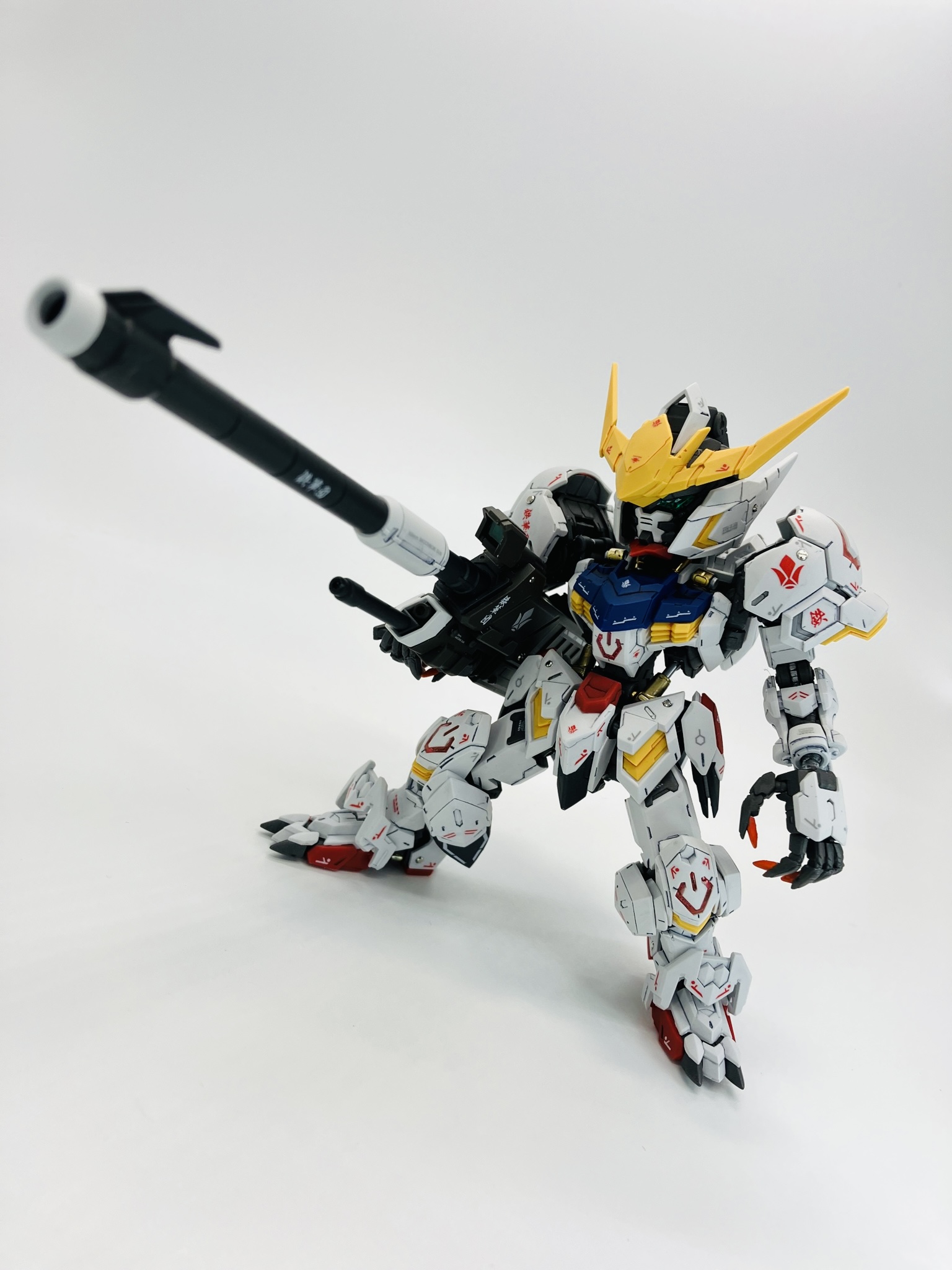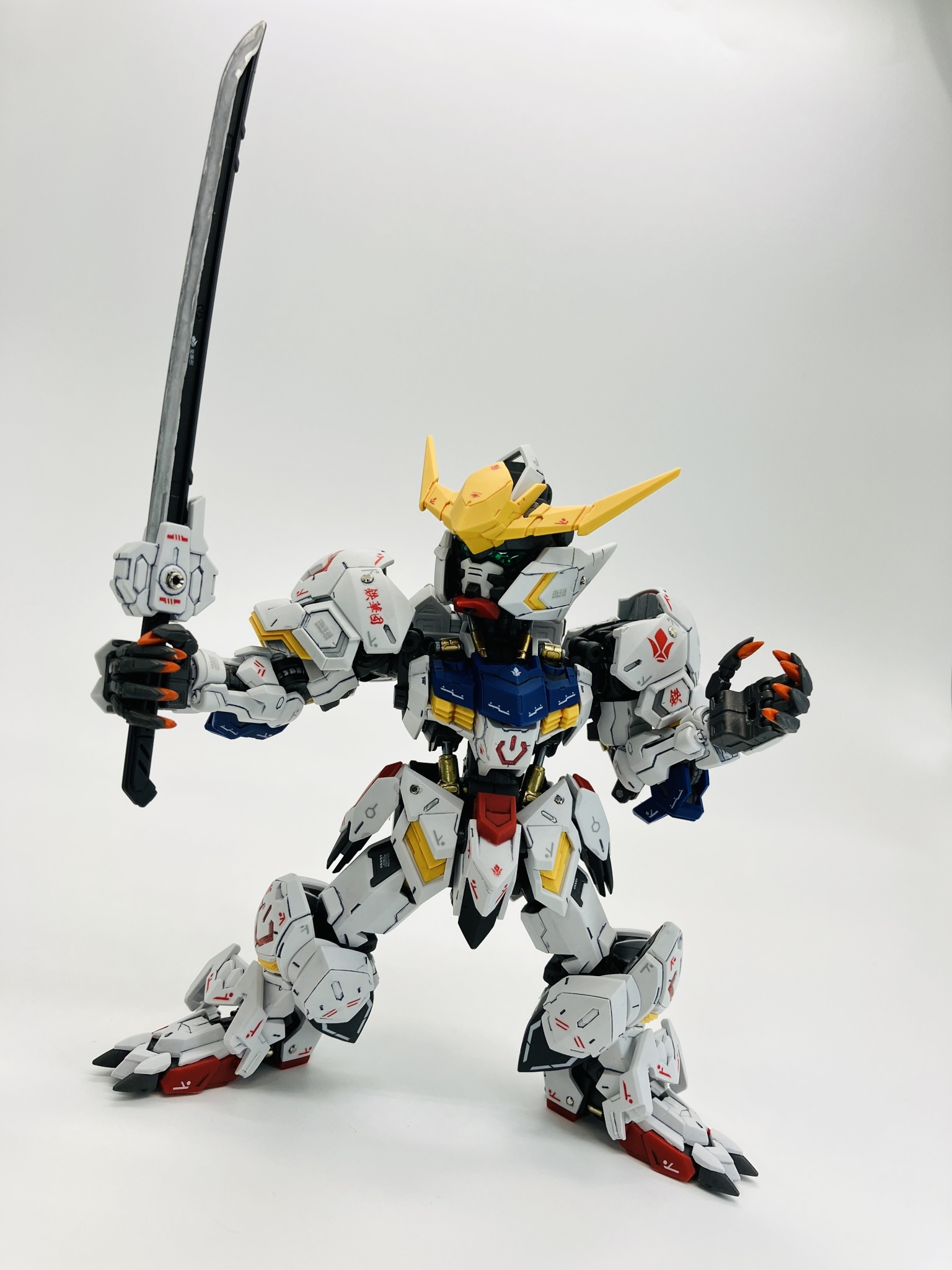 マスターグレードSDガンダムバルバトス、成形色にスミ入れと部分塗装、デカールにトップコートの簡単フィニッシュにメタルパーツのちょいプラスです🥴