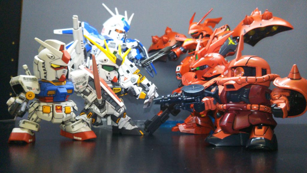 SD ν(ニュー)ガンダムを製作しました。2体使ってダブルフィンファンネルを再現してみました。本体のカラーはver.KA風にしています。フィンファンネルの色塗り…正直大変だったわぁ…(苦笑)