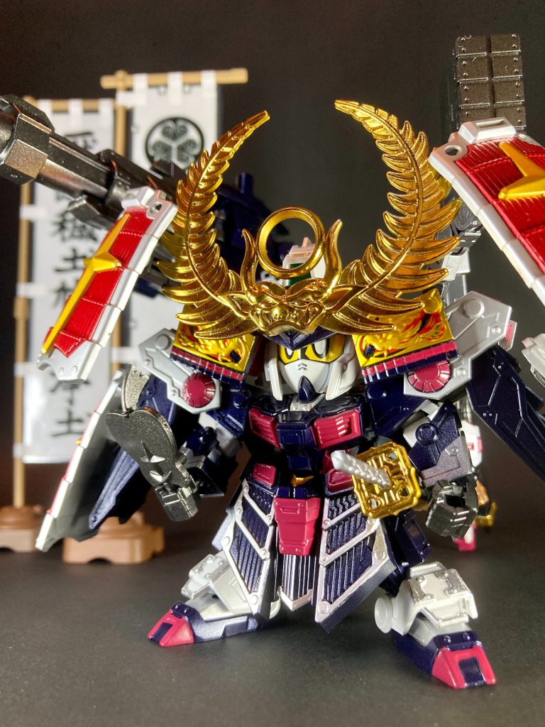 またSD戦国伝・武神降臨編「徳川家康頑駄無」が、元キットがファーストガンダム大将軍という事で両肩部に大袖のような大型シールドを2枚装備している印象が強くありますが、こちらもサンボル版4枚盾の特徴的な外観とイメージの重なる所を感じて同様に再現しました。