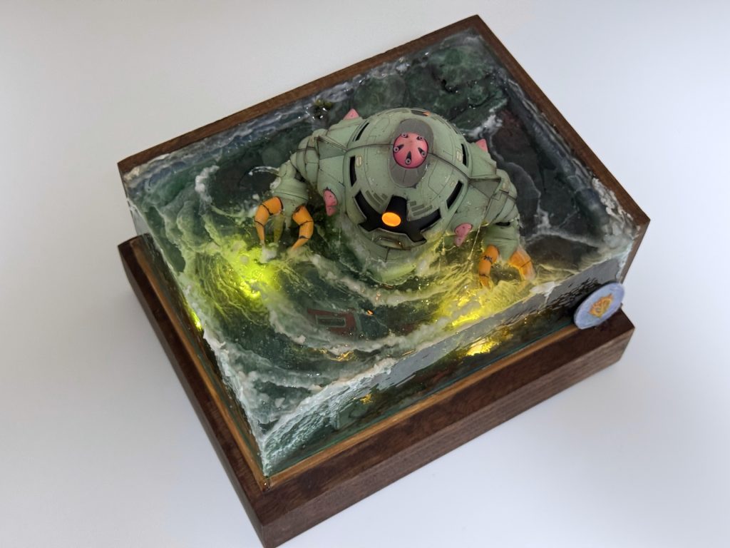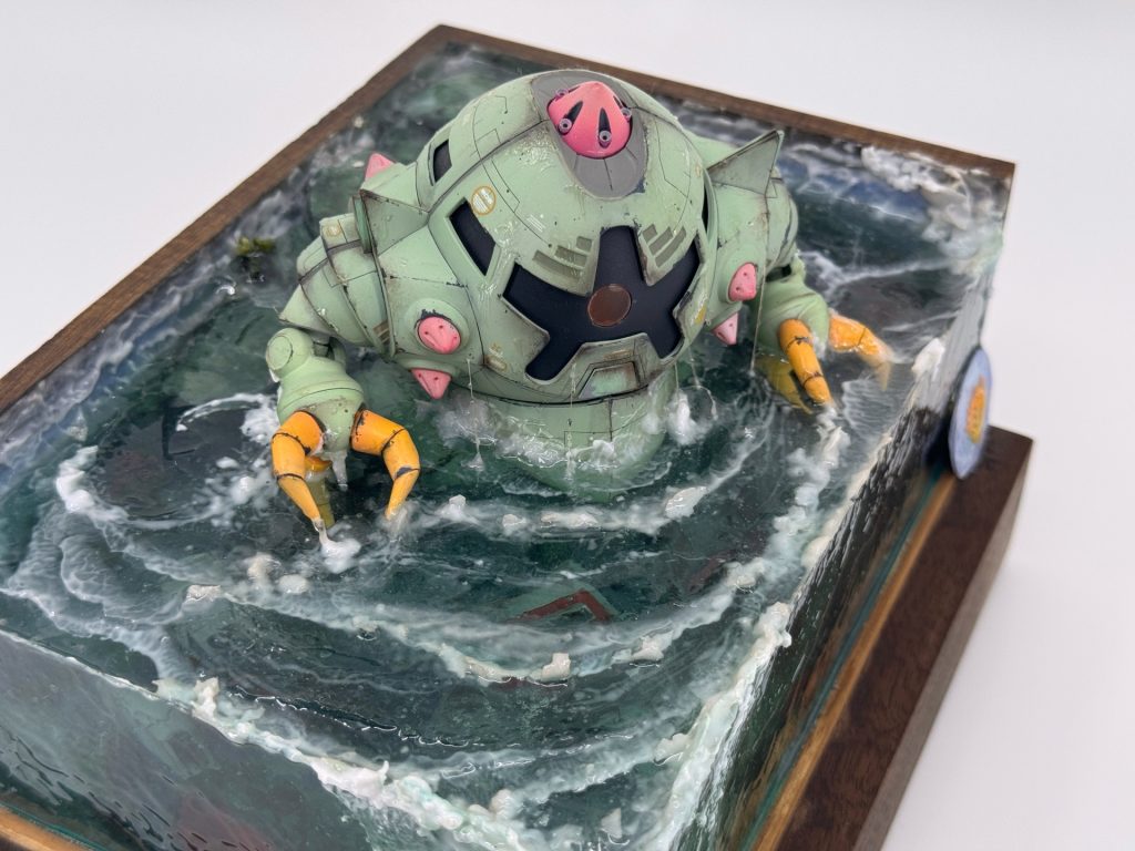 水中には海底のディティールに加えてザクの残骸や連邦系の爆損した部分、シールドなども沈めています。木のベースはダークウォールナットを使ったのでズッシリ重いです