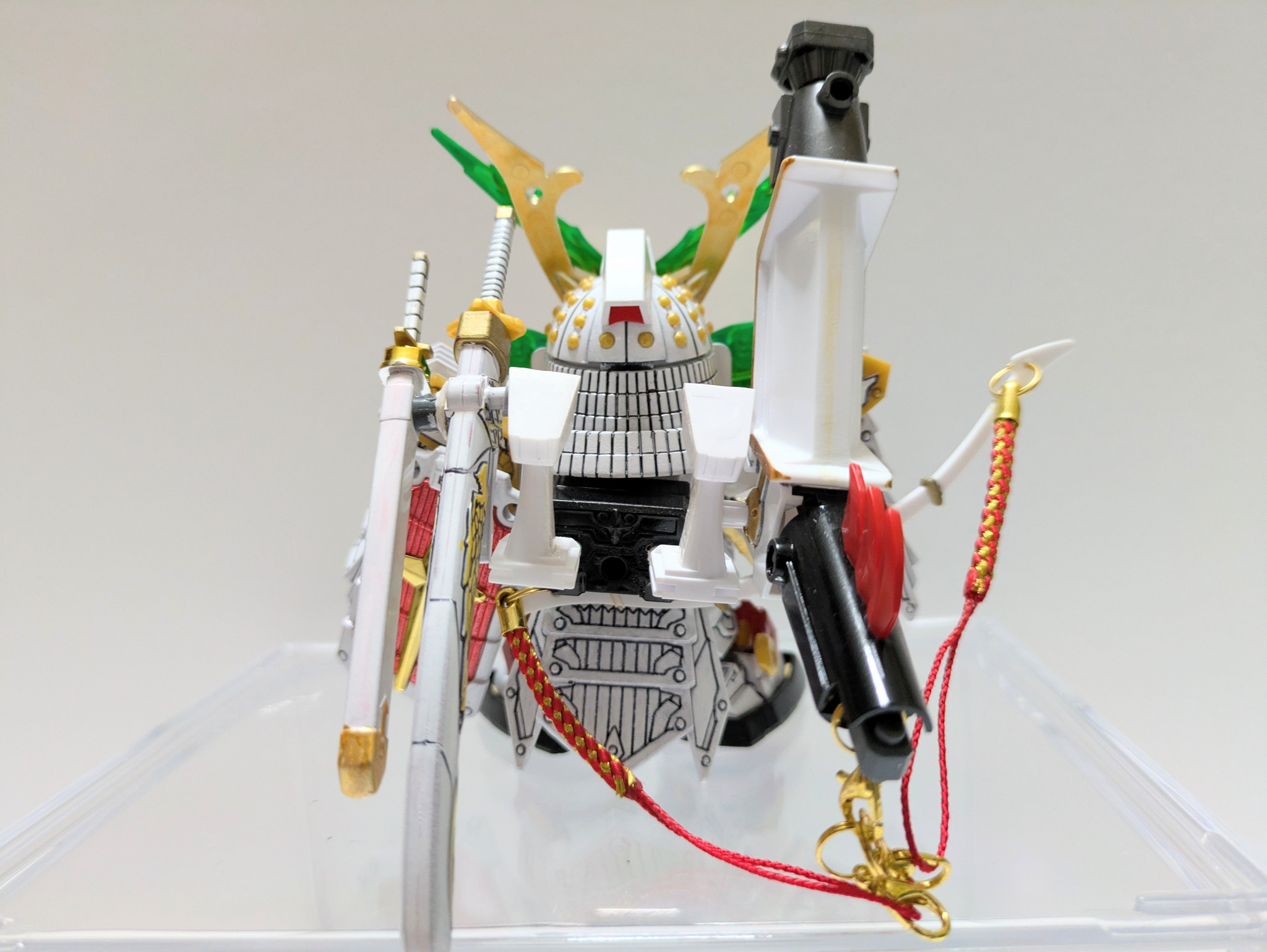 復活した輝羅鋼がいいアクセントとなってくれました。兜飾りは78代目のものだけだと寂しかったのでファースト大将軍の兜飾りと融合。より武者鎧っぽくなって満足です。また、胸から腰に伸びる綱飾りはモチーフのパイプを再現しています。100均にいいものがあって採用しました。