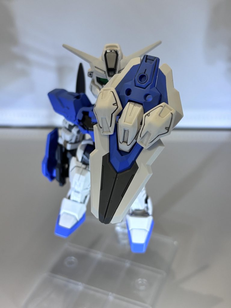 どうせならエクシアの武装を付けれるだけつけたいと試行錯誤して、GNシールドにエクシアのショートブレイドとロングブレイドを取り付け、3ミリ穴を開けてからビットも付けれるようにした結果、大型の武器みたいな感じになりました