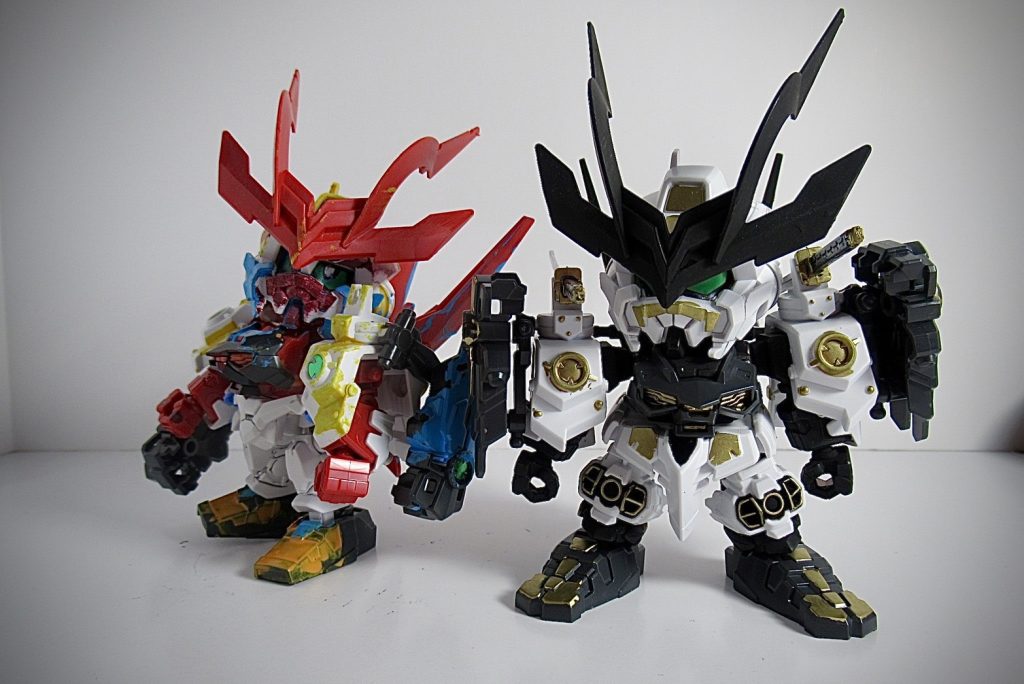 六体目のSDになる。毎回大変だと言いながらもお手軽価格でつい買ってしまう。息子ちゃんの分と合わせて2体で千円ちょっとは嬉しい。ヘルメットやマスクを外せる仕様になっている。アストレイのデザインからか塗装エリアもシンプルで楽しかった。息子ちゃんはファイタースタイルの設定で組み立てたらしい。最後は二人の戦国アストレイのツーショット。