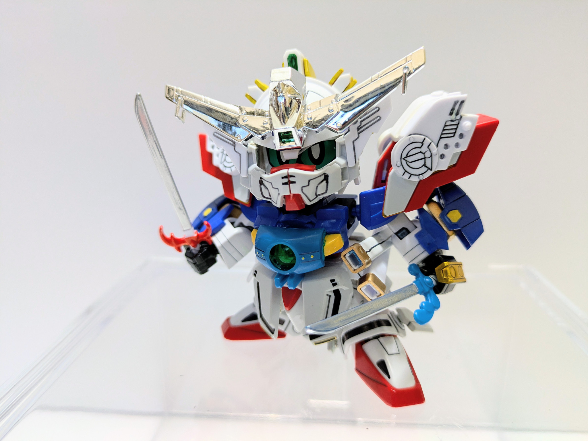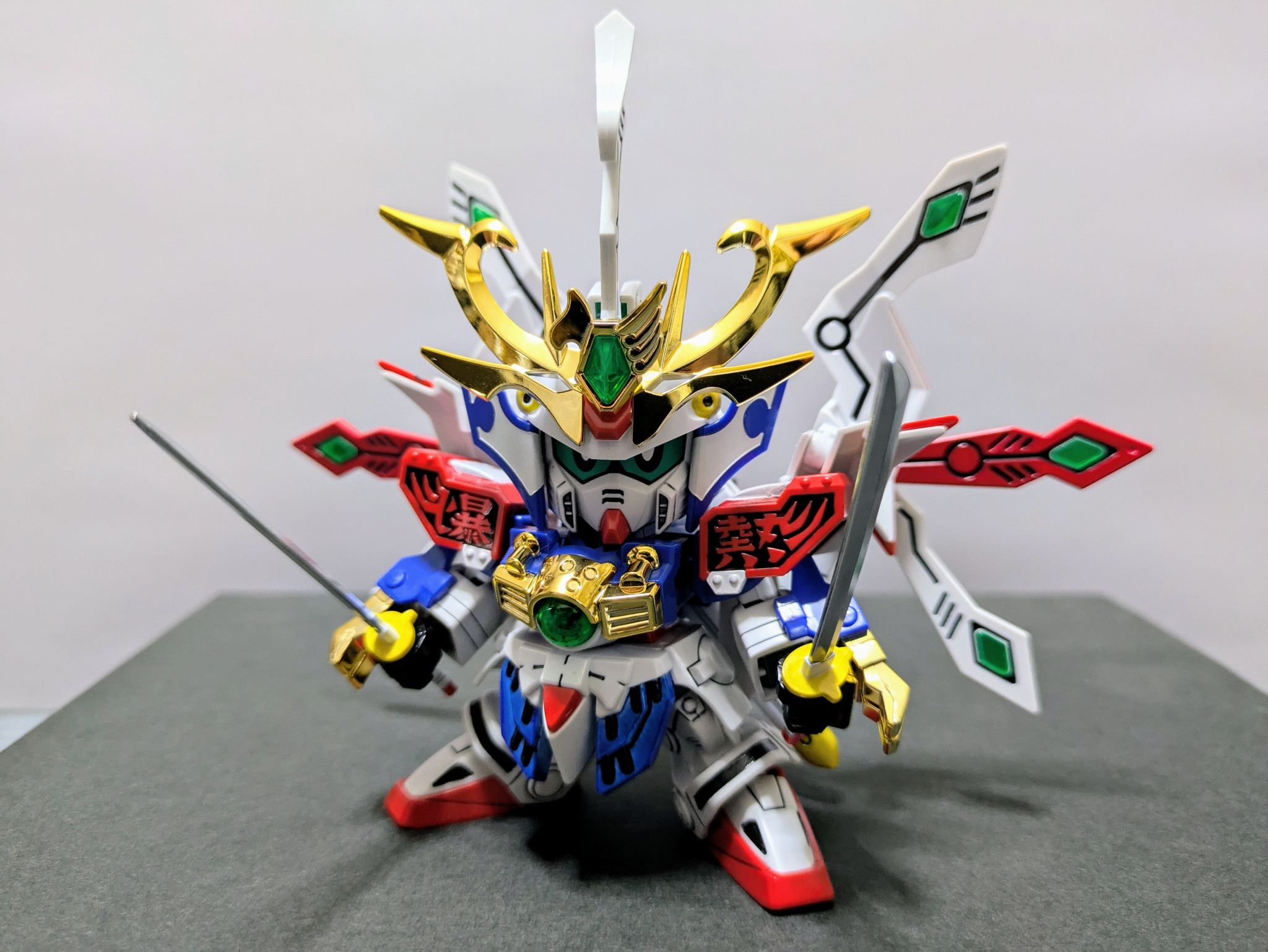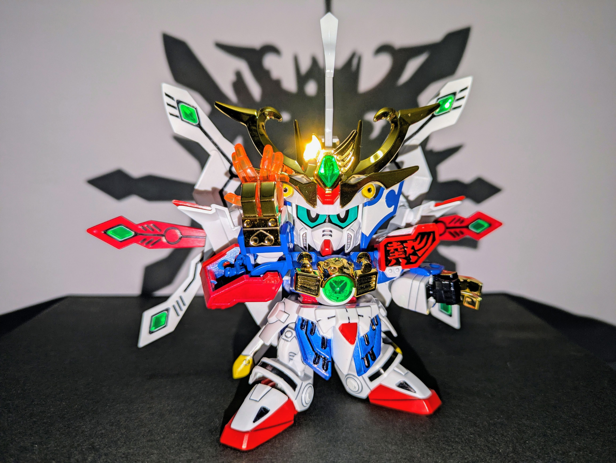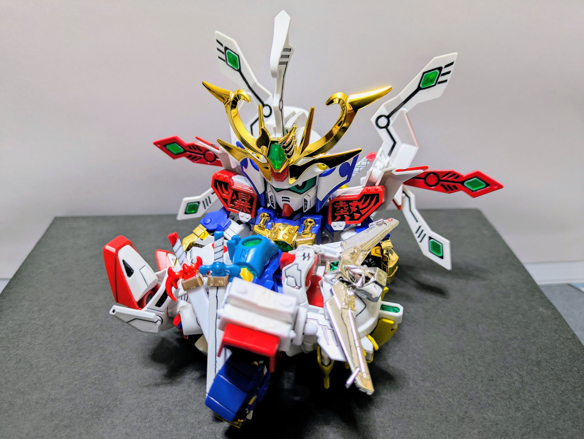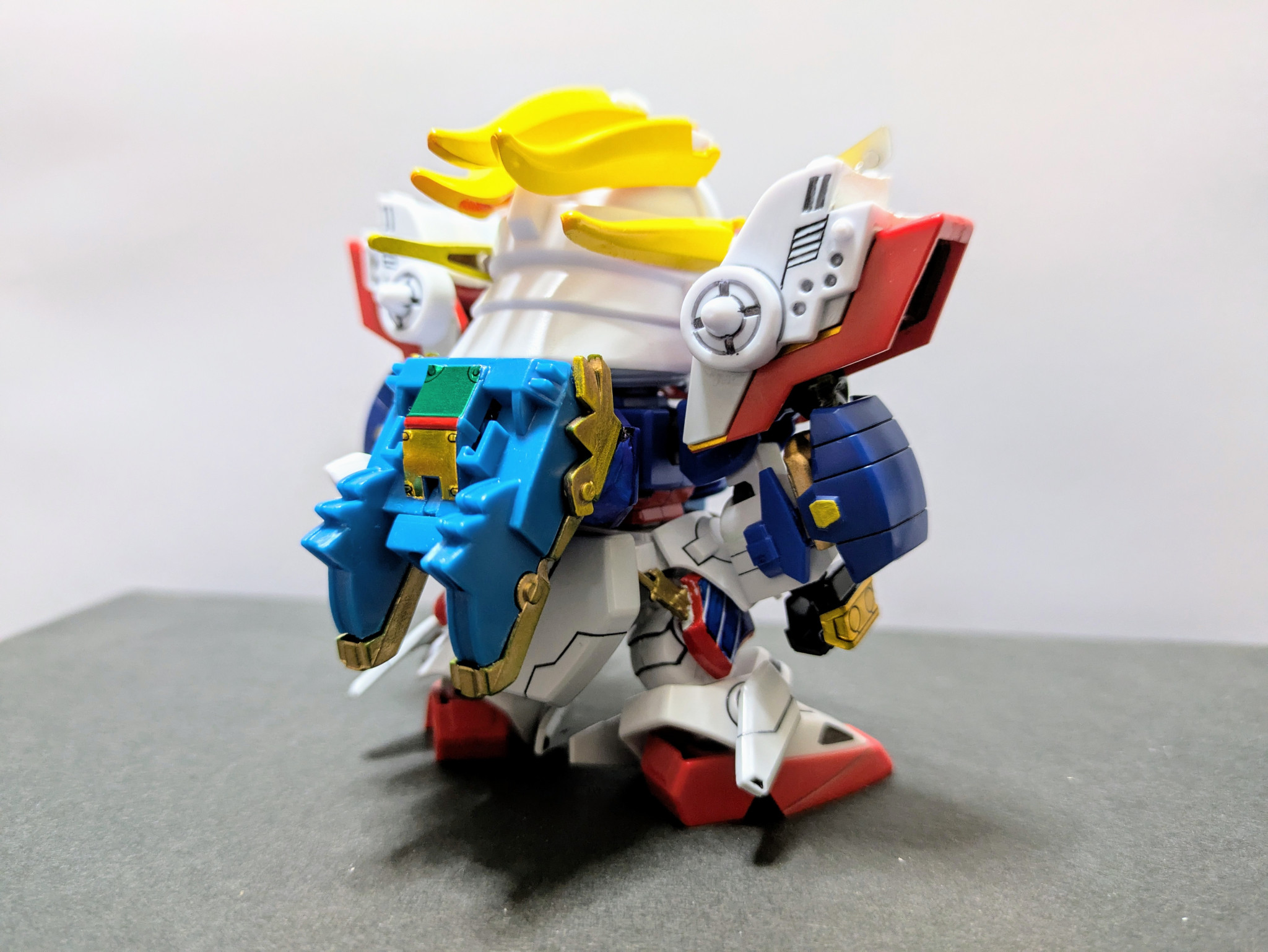 ベースキット『LEGEND BB 武者號斗丸』に『Gジェネネオ シャイニングガンダム』『爆流頑駄無』『爆熱頑駄無』の3キットをミキシング。鎧兜は爆熱のが意外にすっぽり入ったのでジョイントをいじって爆流の兜飾りを削って取り付けました。やはり兜飾りはメッキが映えますね。当初は元ネタのキットは使用せずに挑戦したいと考えていましたがパーツのストックも足りず、力及ばず断念。結局シャイニングのパーツ頼りの造形に妥協してしまいましたが、一見してモチーフを想起できる見映えにはなってくれたかなと思います。