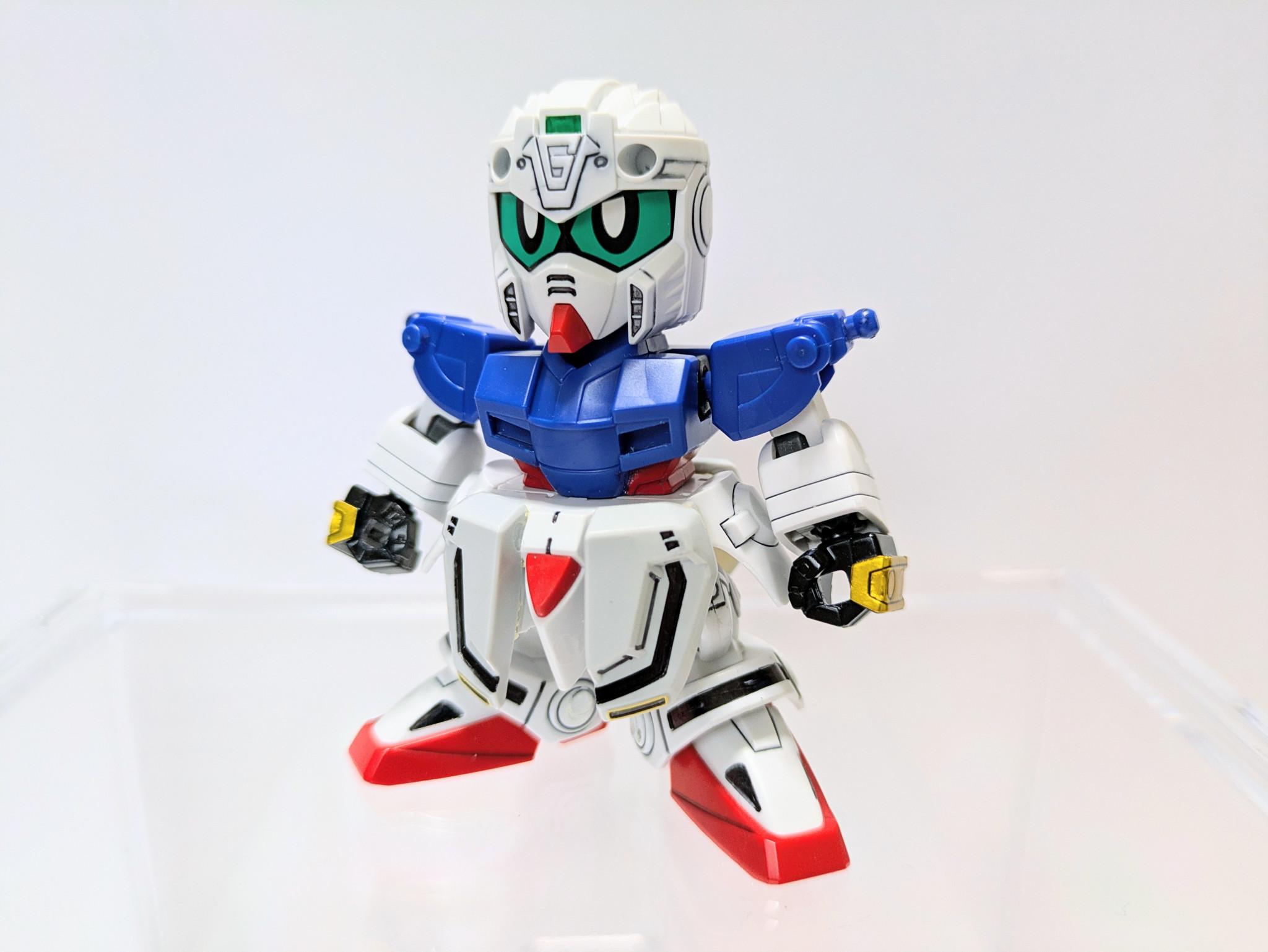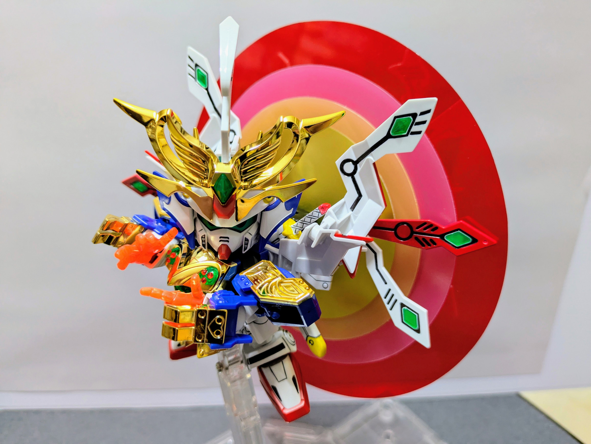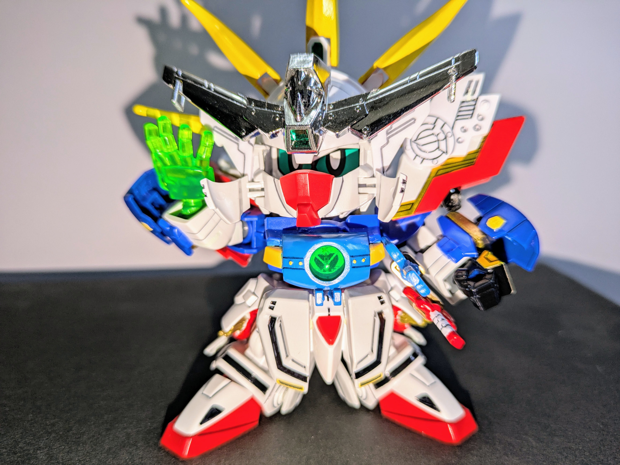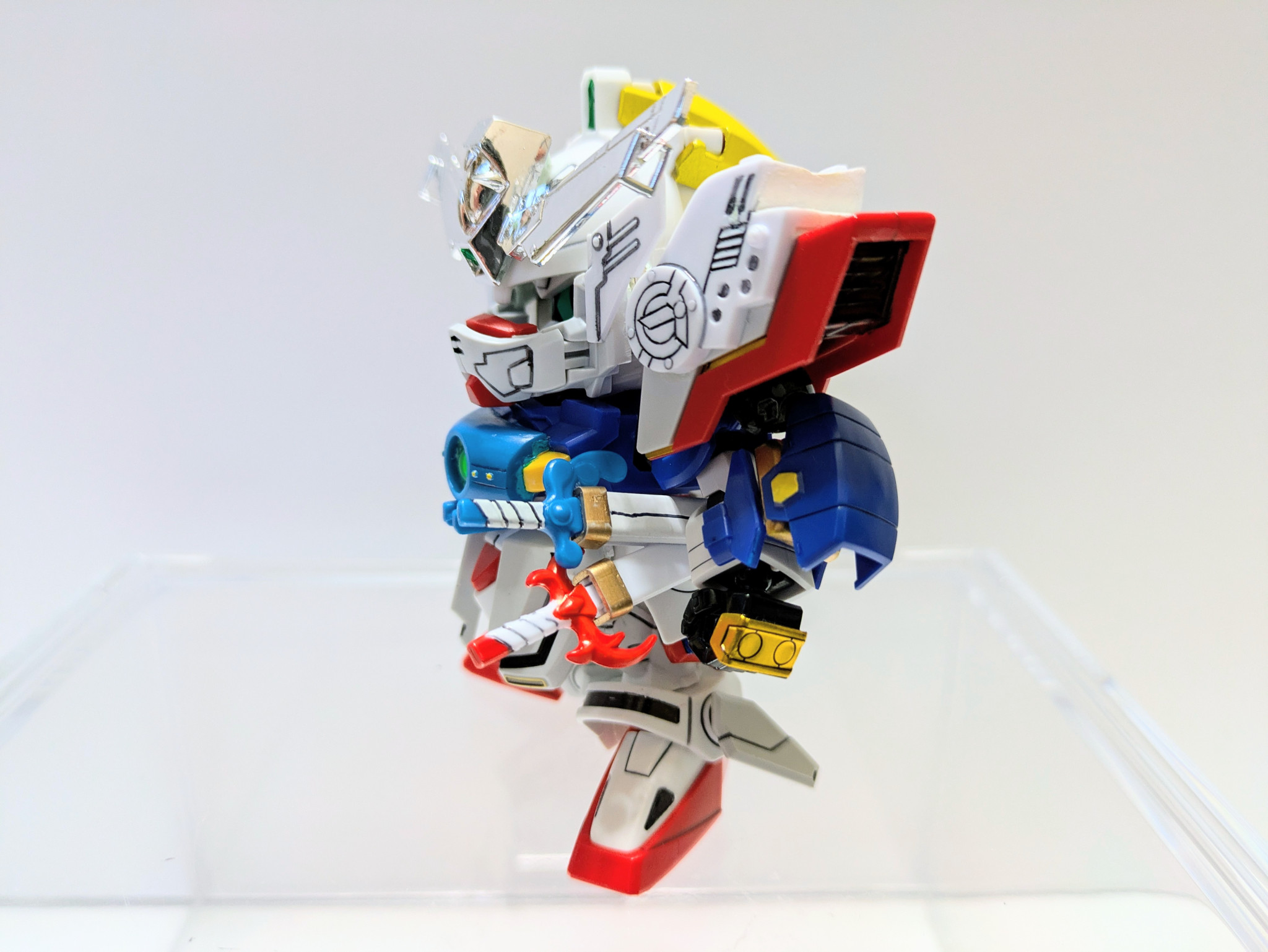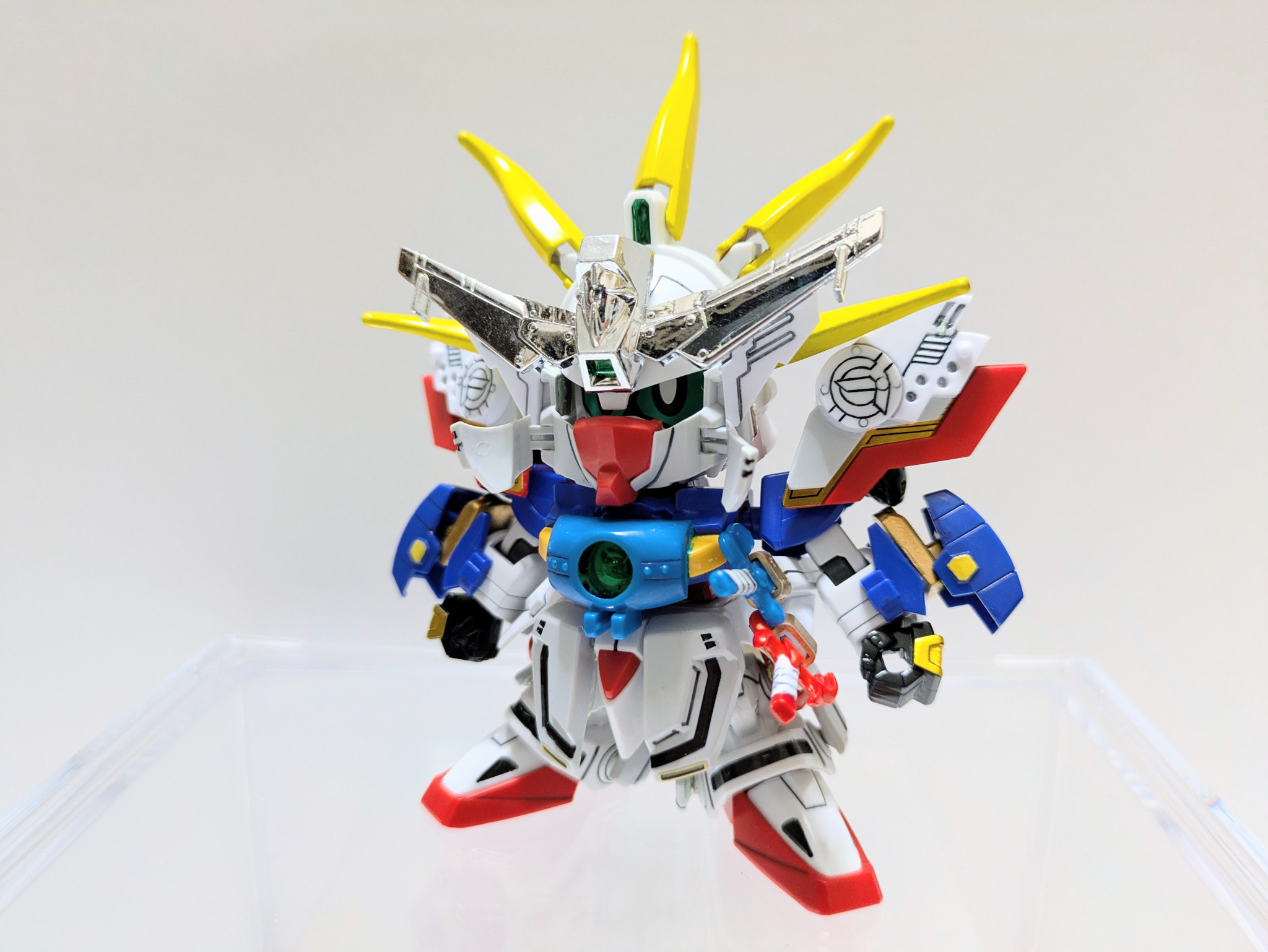ベースキット『LEGEND BB 武者號斗丸』に『Gジェネネオ シャイニングガンダム』『爆流頑駄無』『爆熱頑駄無』の3キットをミキシング。鎧兜は爆熱のが意外にすっぽり入ったのでジョイントをいじって爆流の兜飾りを削って取り付けました。やはり兜飾りはメッキが映えますね。当初は元ネタのキットは使用せずに挑戦したいと考えていましたがパーツのストックも足りず、力及ばず断念。結局シャイニングのパーツ頼りの造形に妥協してしまいましたが、一見してモチーフを想起できる見映えにはなってくれたかなと思います。