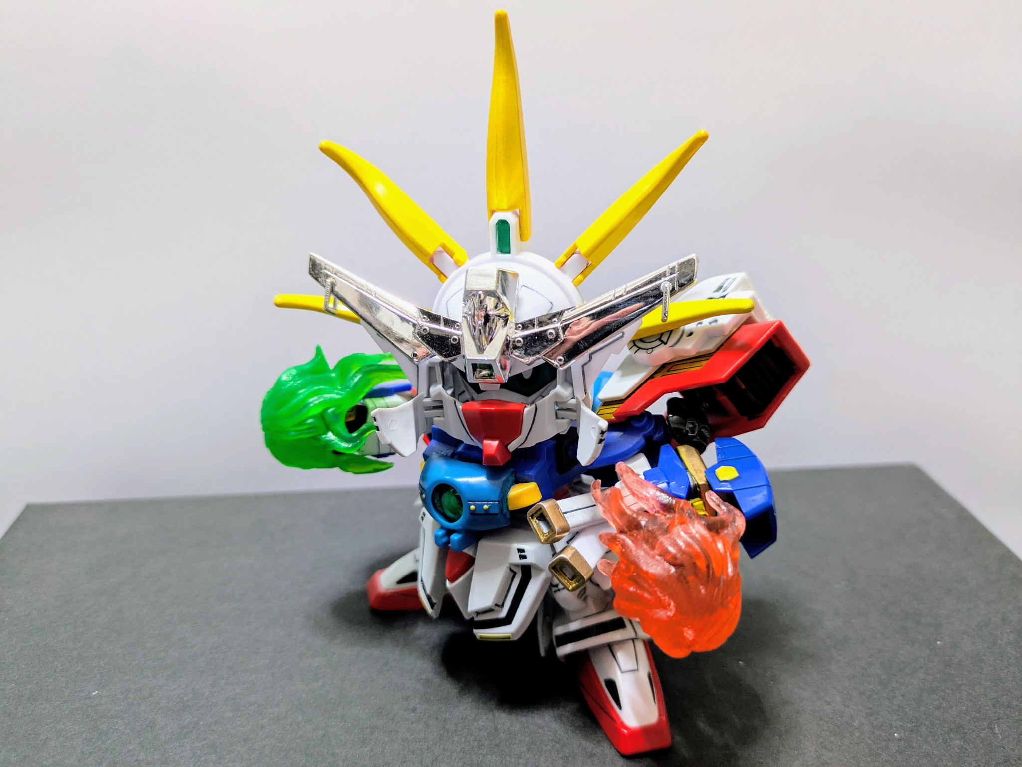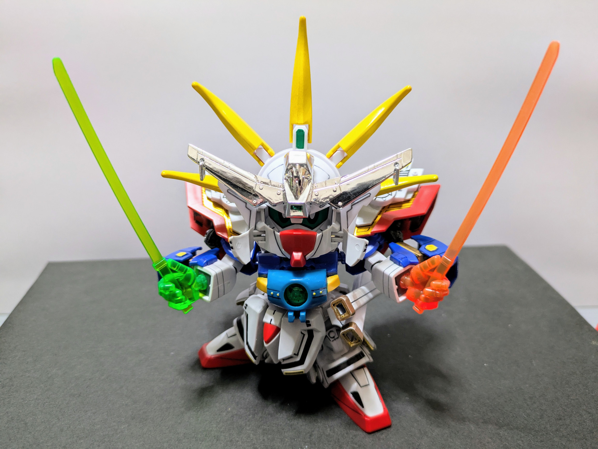こちらもオリジナルギミック。武器として爆流の爆炎剣&水流刀を腰に携えさせています。それを抜刀した姿が2枚目の写真なんですが、それがさらに光の力を得てパワーアップ。緑は元ネタキットから、オレンジはGジェネのゴッドから拝借しました。シャイニングは右手、ゴッドは左手と偶然にもサーベルを持つ手が逆だったのでうまくいきました。