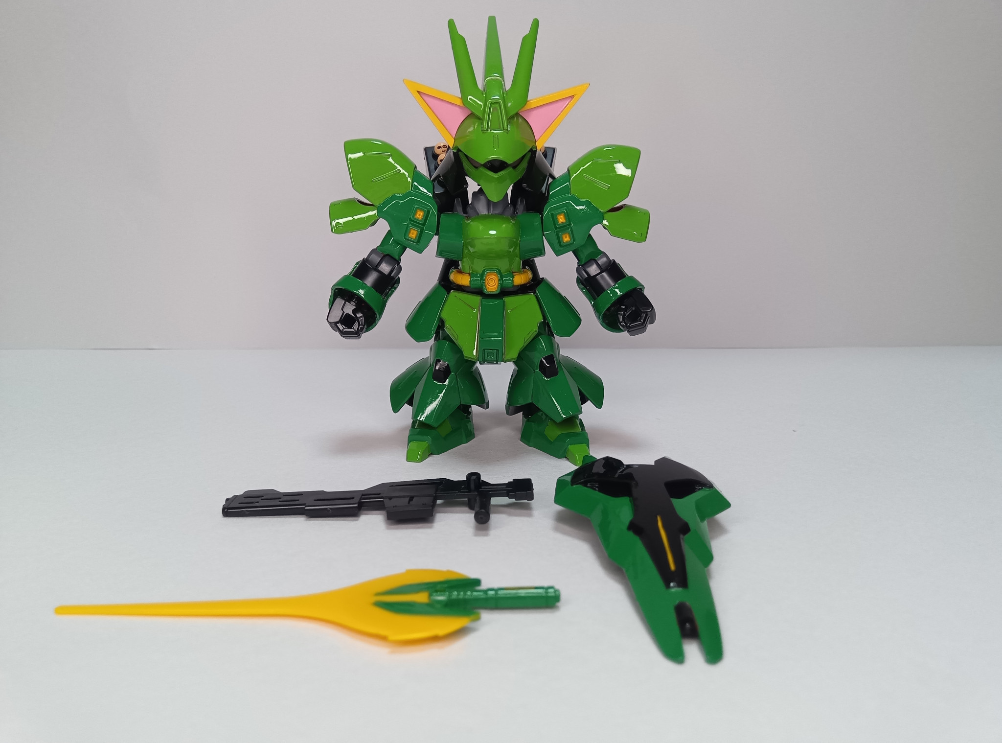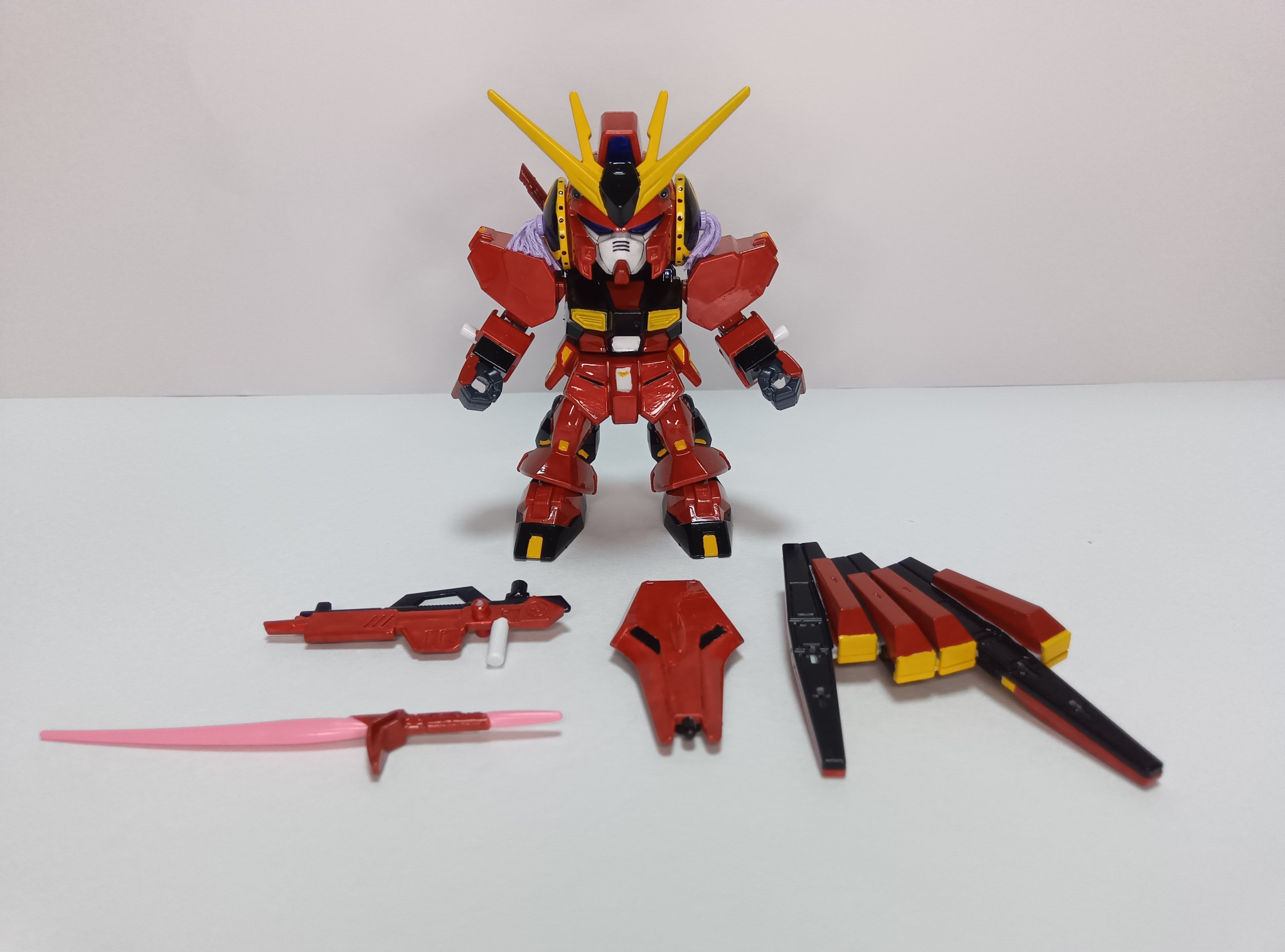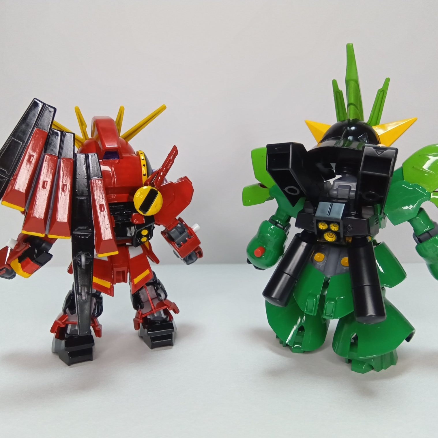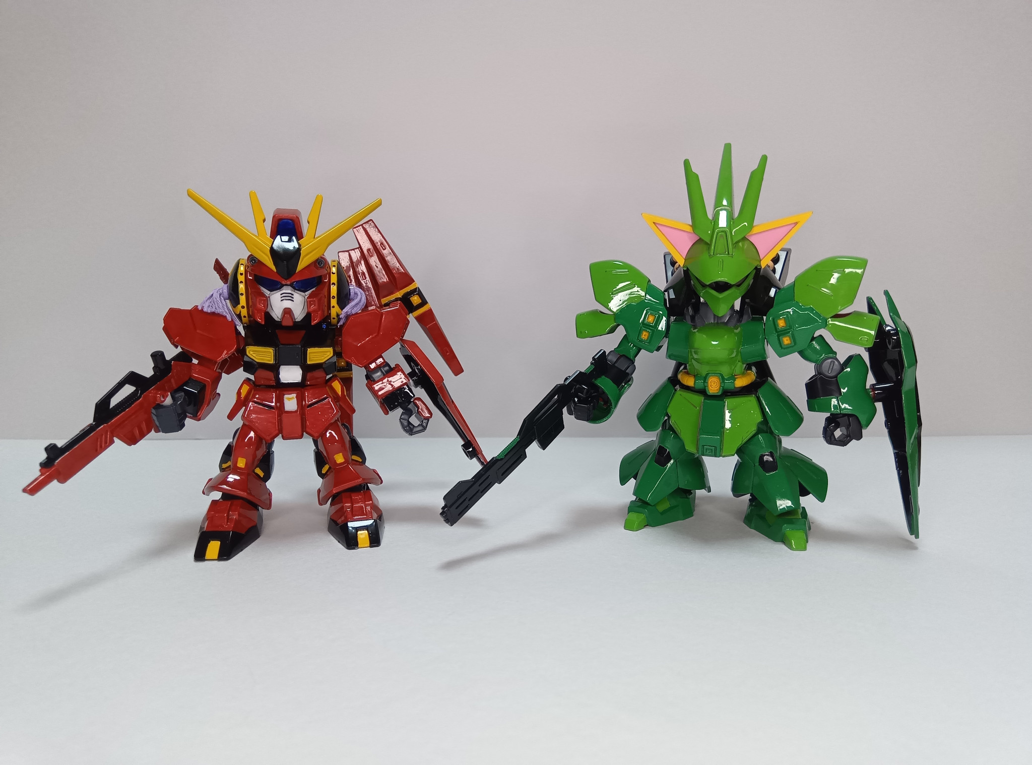 νガンダムVer.神楽は以前投稿したドラえもんカラー(https://gumpla.jp/sd/25023144)を落として、頭部側面を削り落としプラバンで制作した飾りを接着。