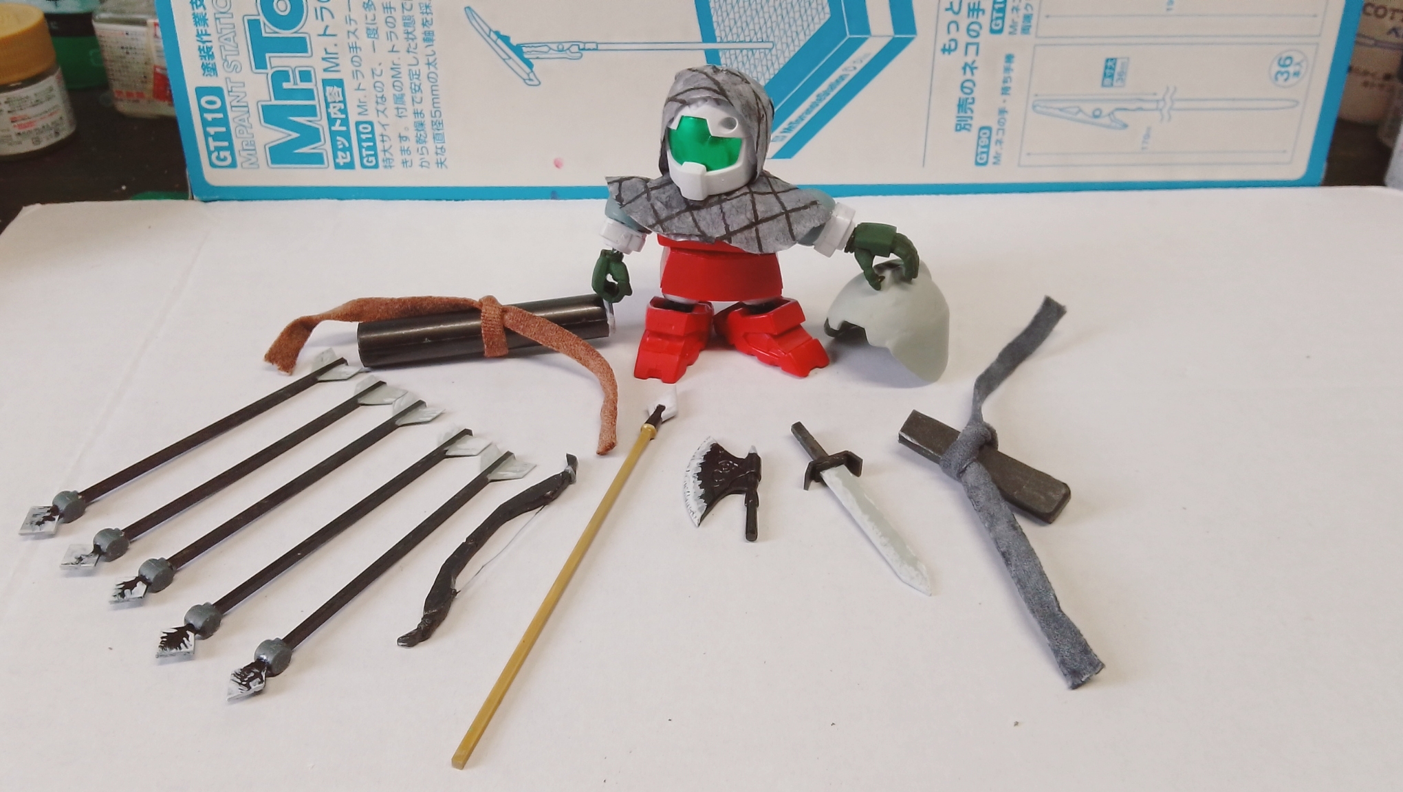 弓矢をつがえるポーズの為に内部を削ってスイング可動を仕込んでいます。