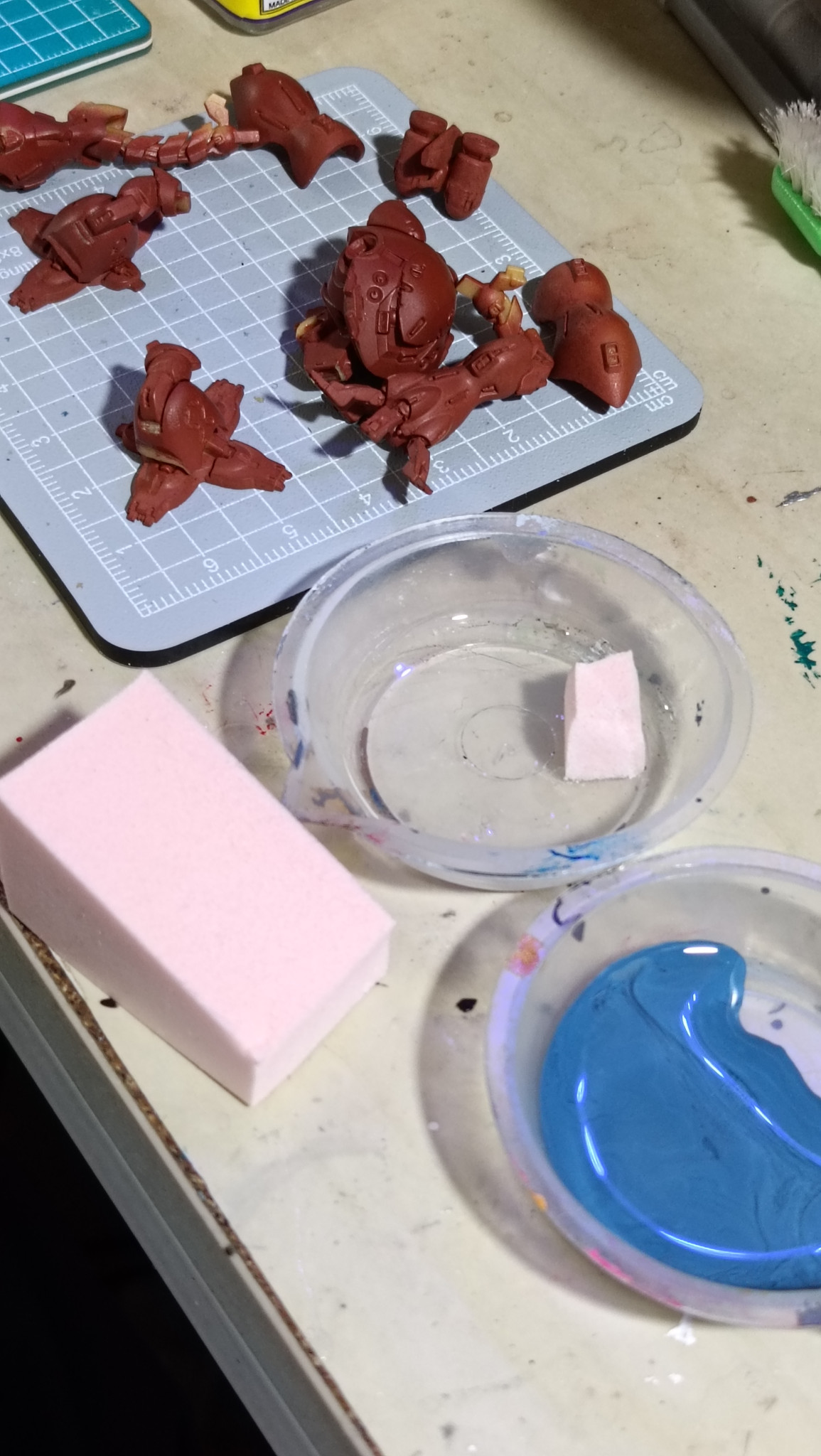スポンジなので細かい所には下地を残しながら1色乗せた後、より明るい色でドライブラシをします。