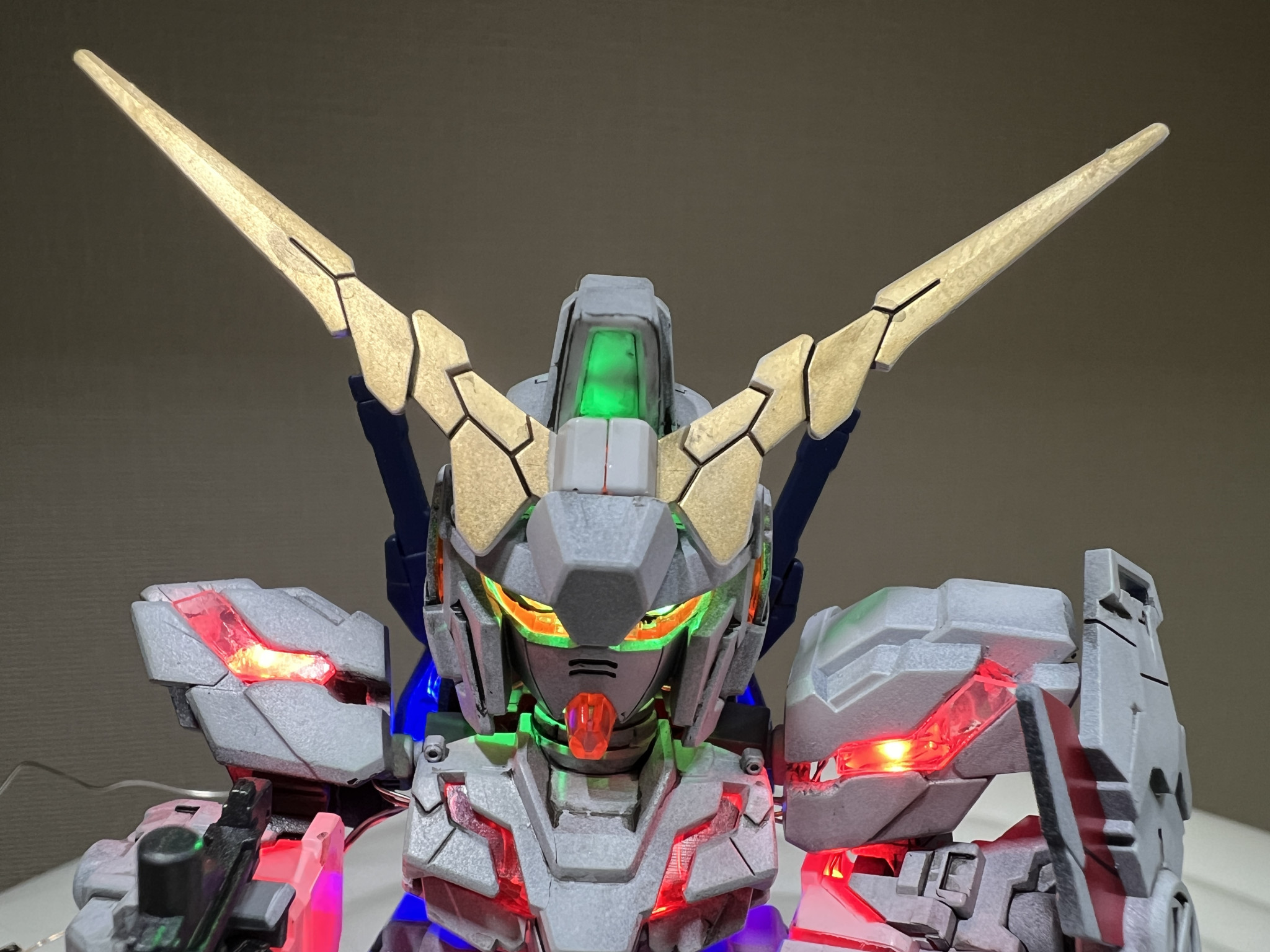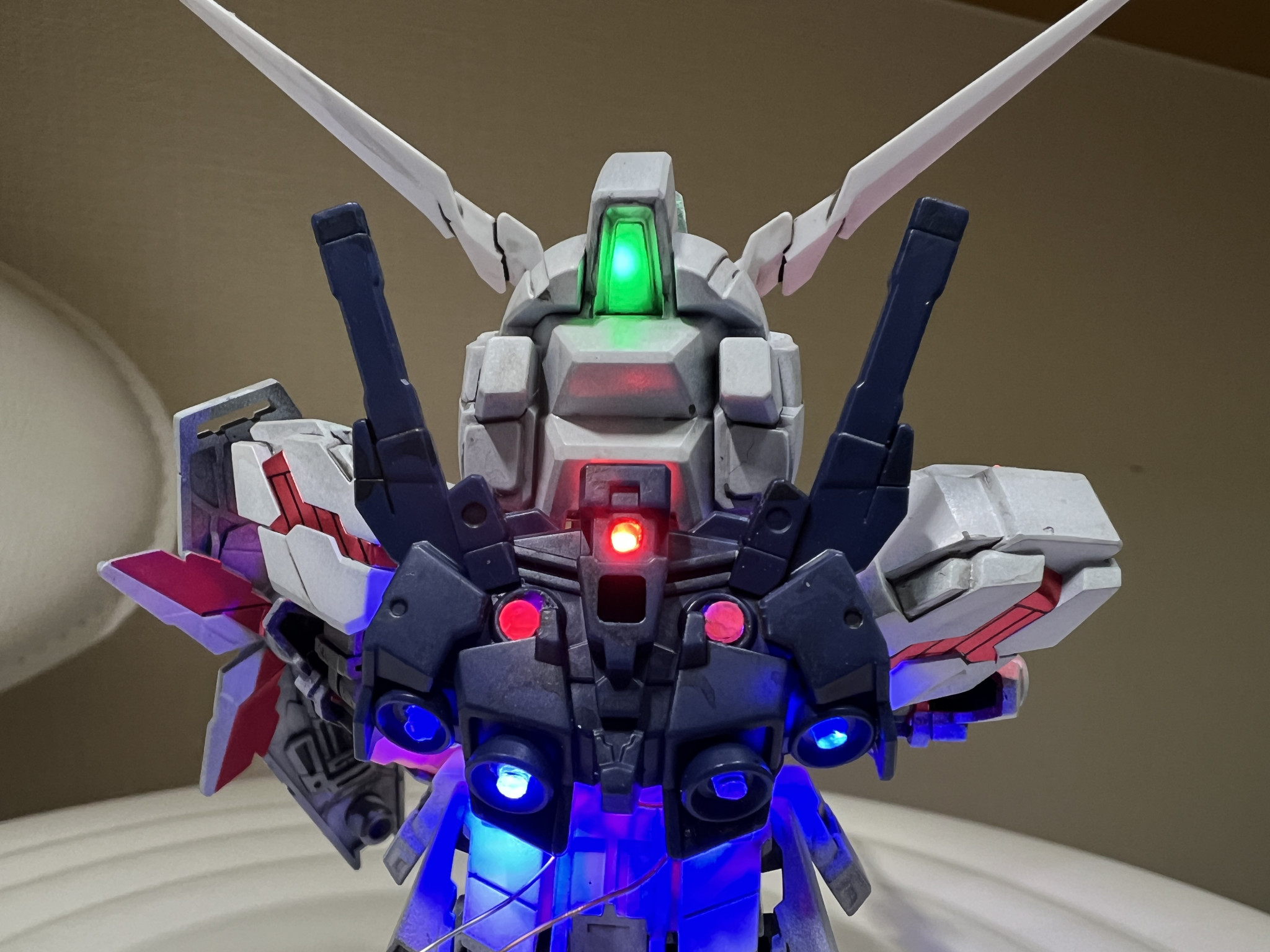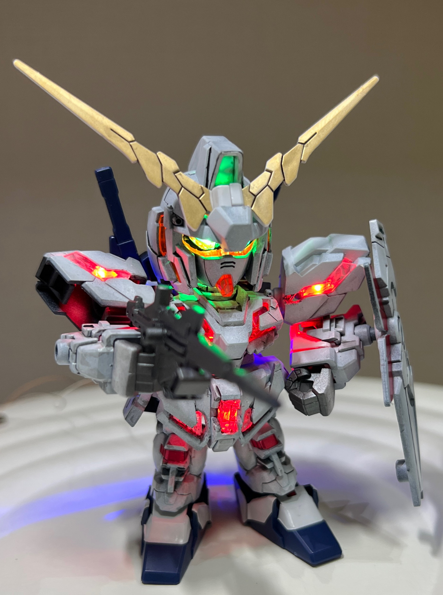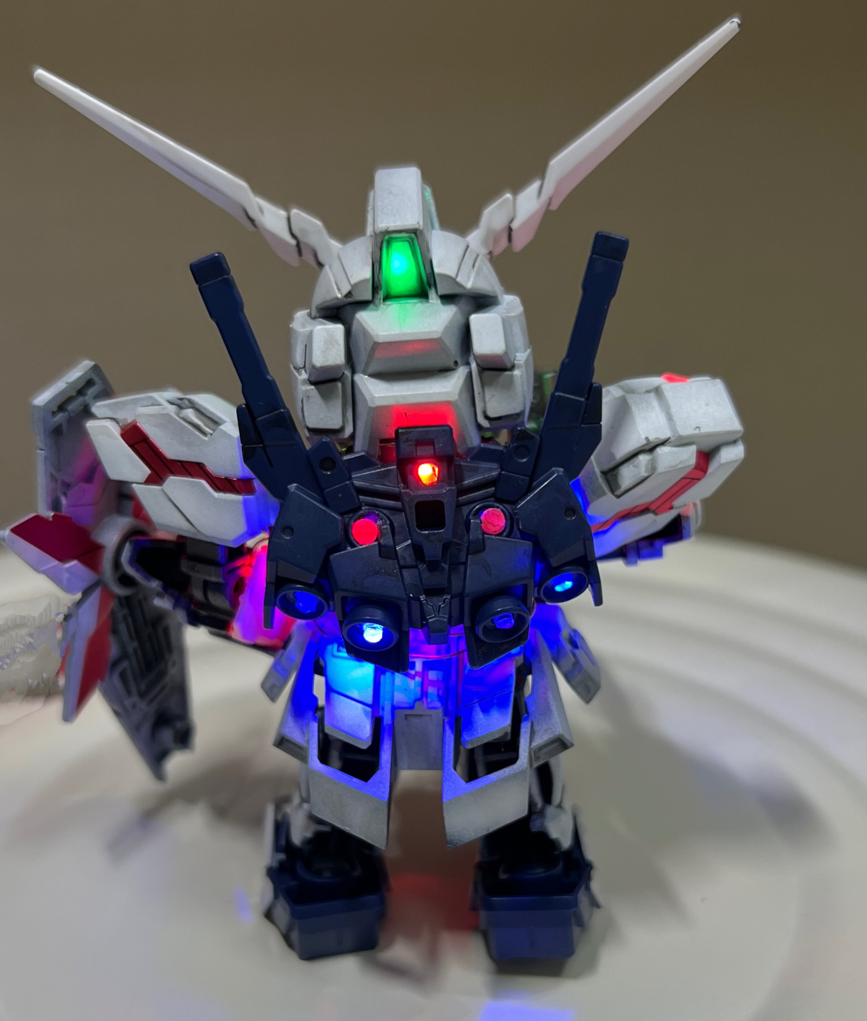 SDガンダムEXスタンダードのユニコーンガンダム(デストロイモード)を電飾、部分塗装、墨入れで仕上げました。たまに電飾熱発動するんです。HGと比べて顔デカなので頭だけで5個LED仕込んでます。あとは肩、腕、胸、腰、バックパック全て合わせて16個になります。