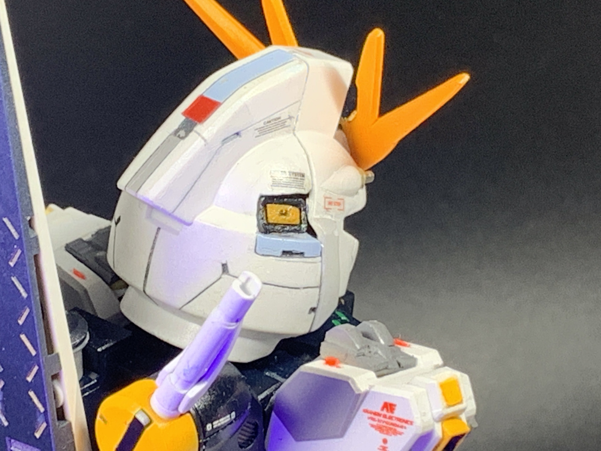 蛍光塗料を使い各所にサイコフレームを表現してみました。そして各所プラ板やスジボリ、デカールで各所ディテールアップしています。