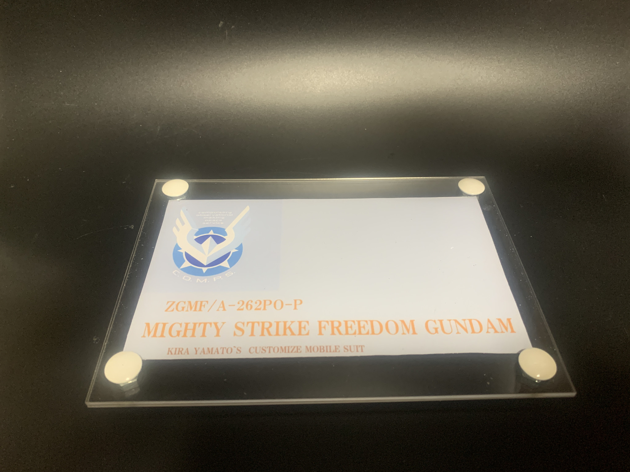 自作の台座。文字はマイフリっぽくゴールド風にしてみたのですが画像ですとイマイチつたわりませんね。(zaku-kao9)